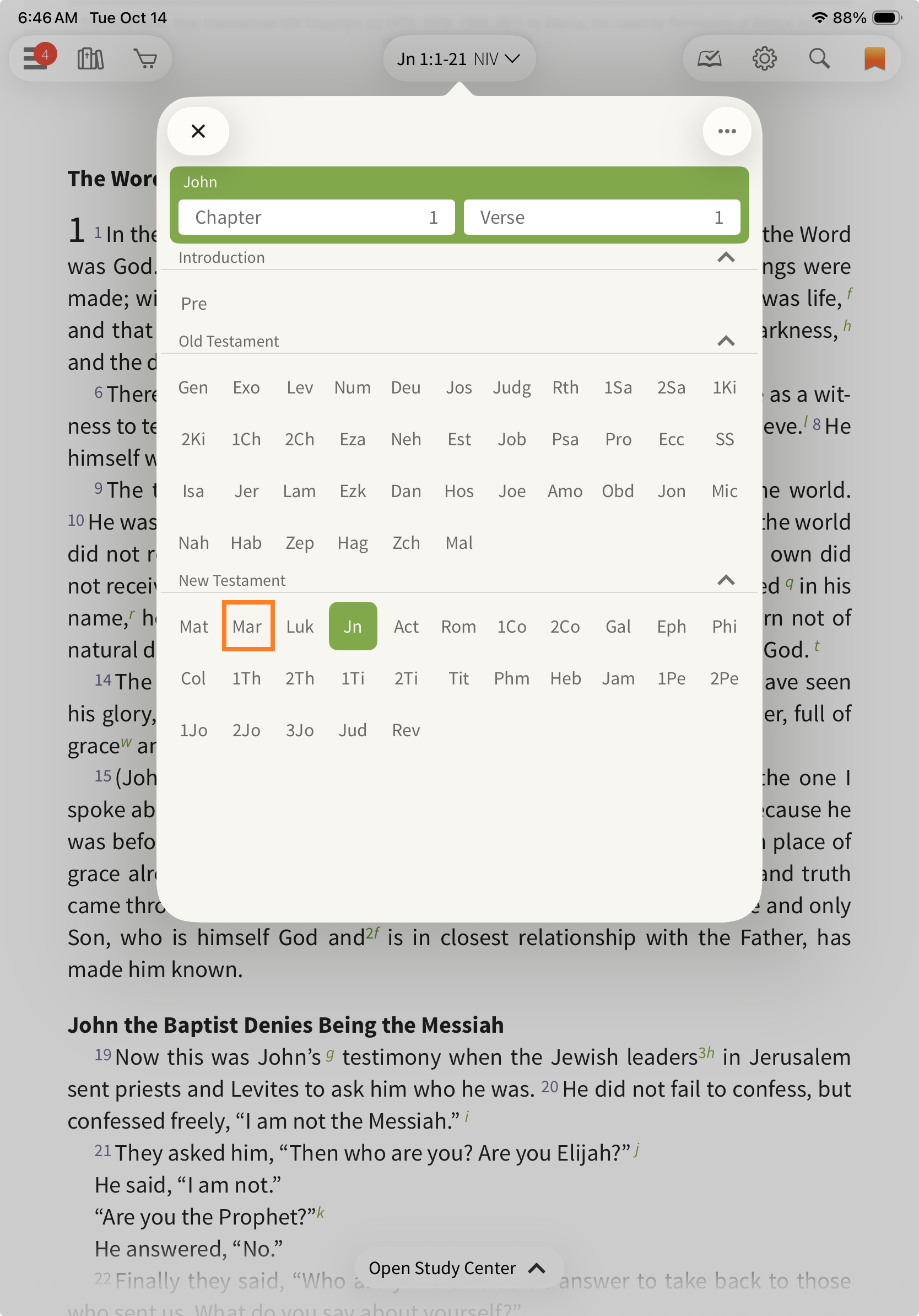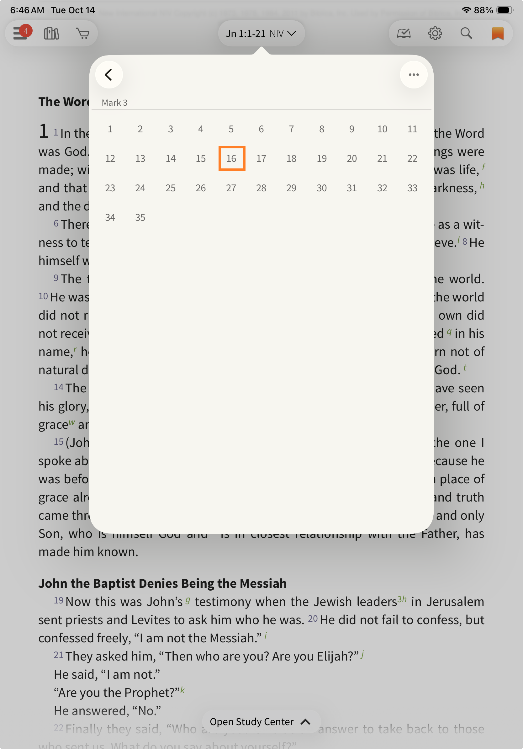 This will open a grid of all the books of the Bible. In this example, I want to go to Mark 3:16.