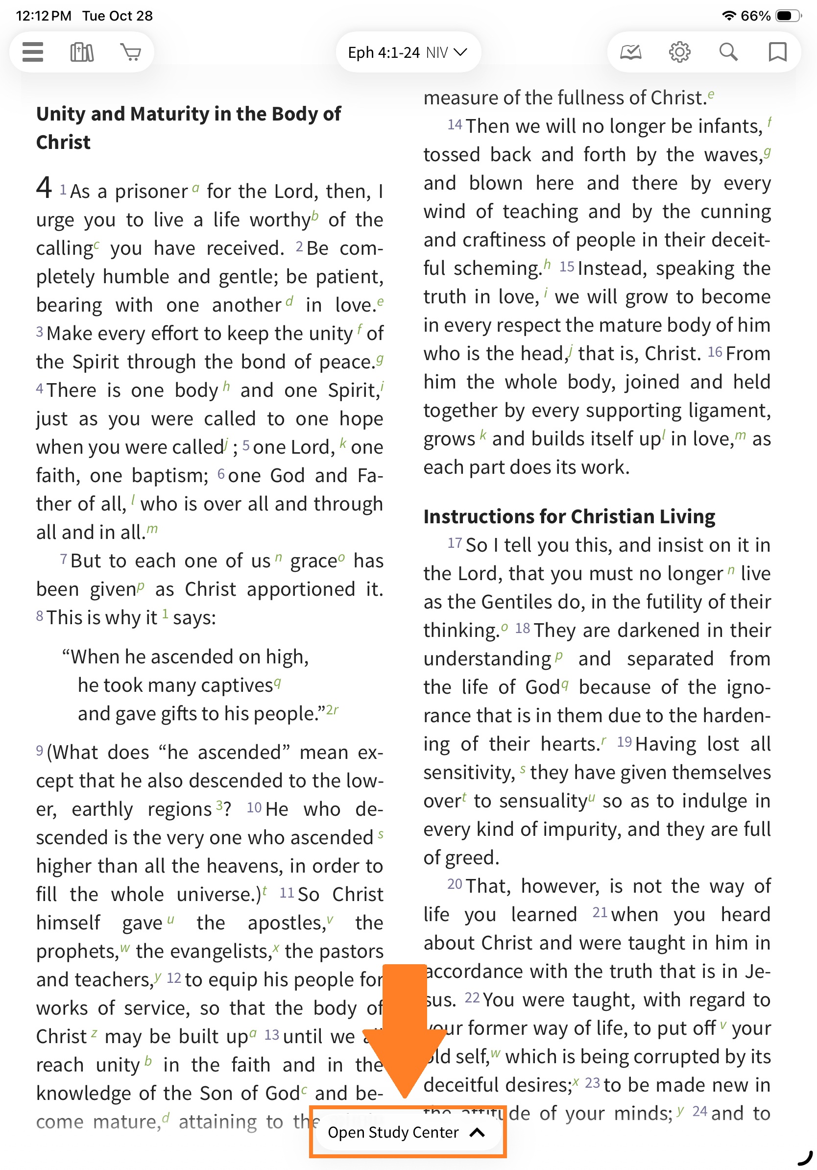 In the Resource Guide, the 'Topics', 'People', and 'Places' categories will also allow you to access some of the entries in your concordance. With your preferred Bible translation open in the main window, select the green 'Open Study Center' tab.