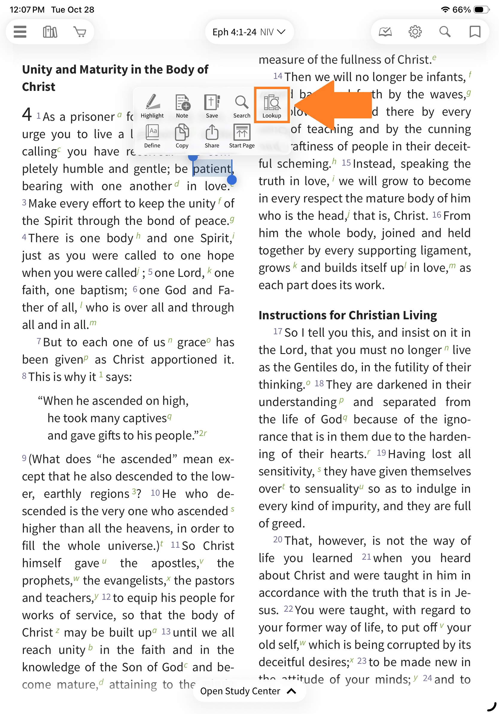 Open a Bible through the Library in the main window. Tap and hold a word and select 'Lookup' to perform a lookup.