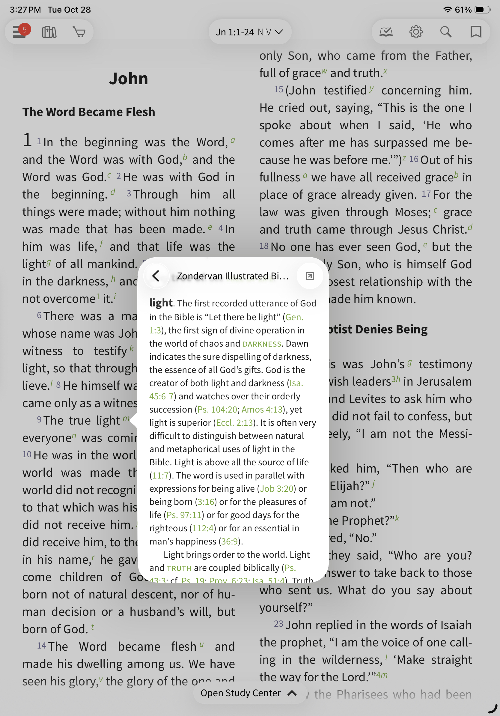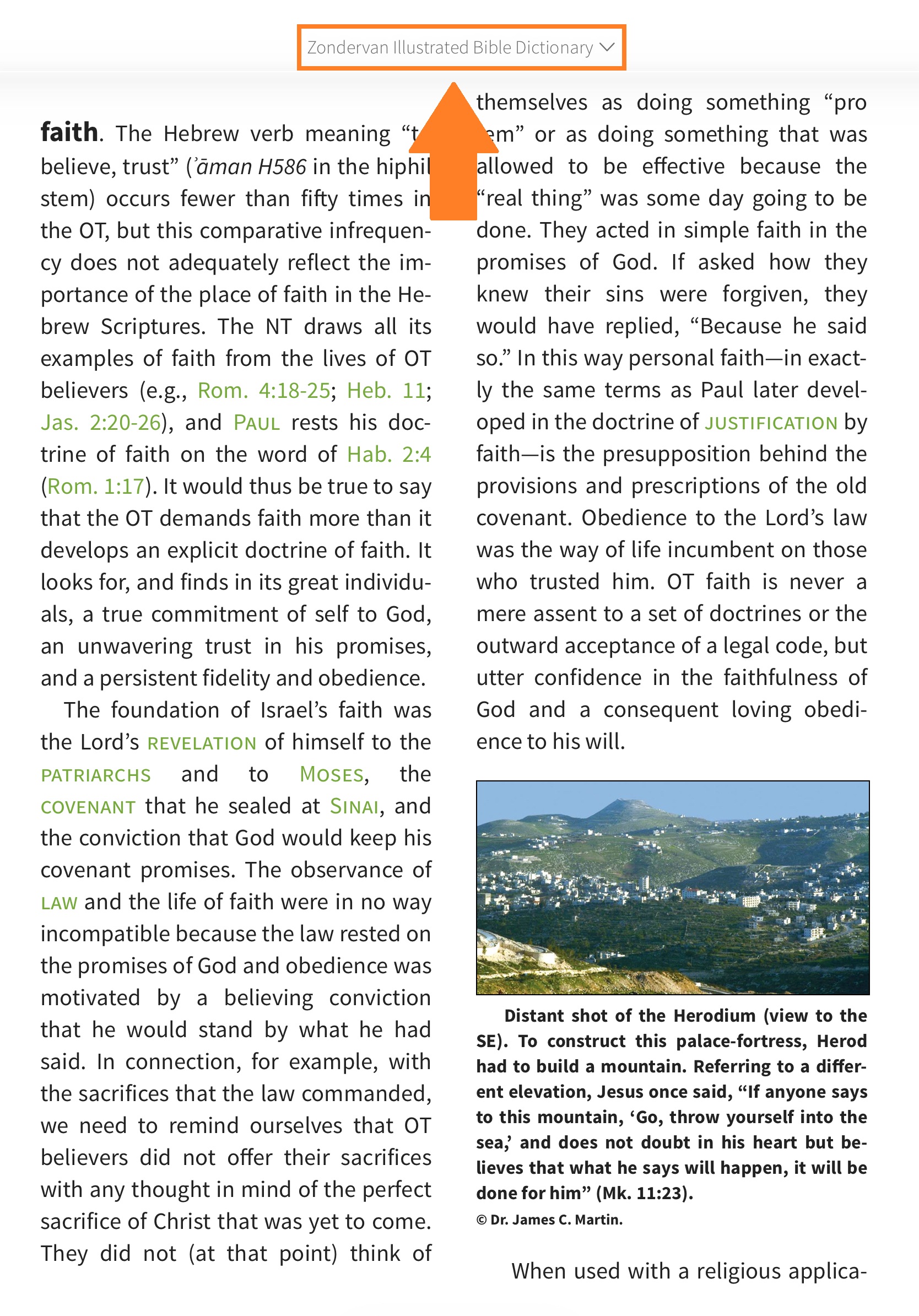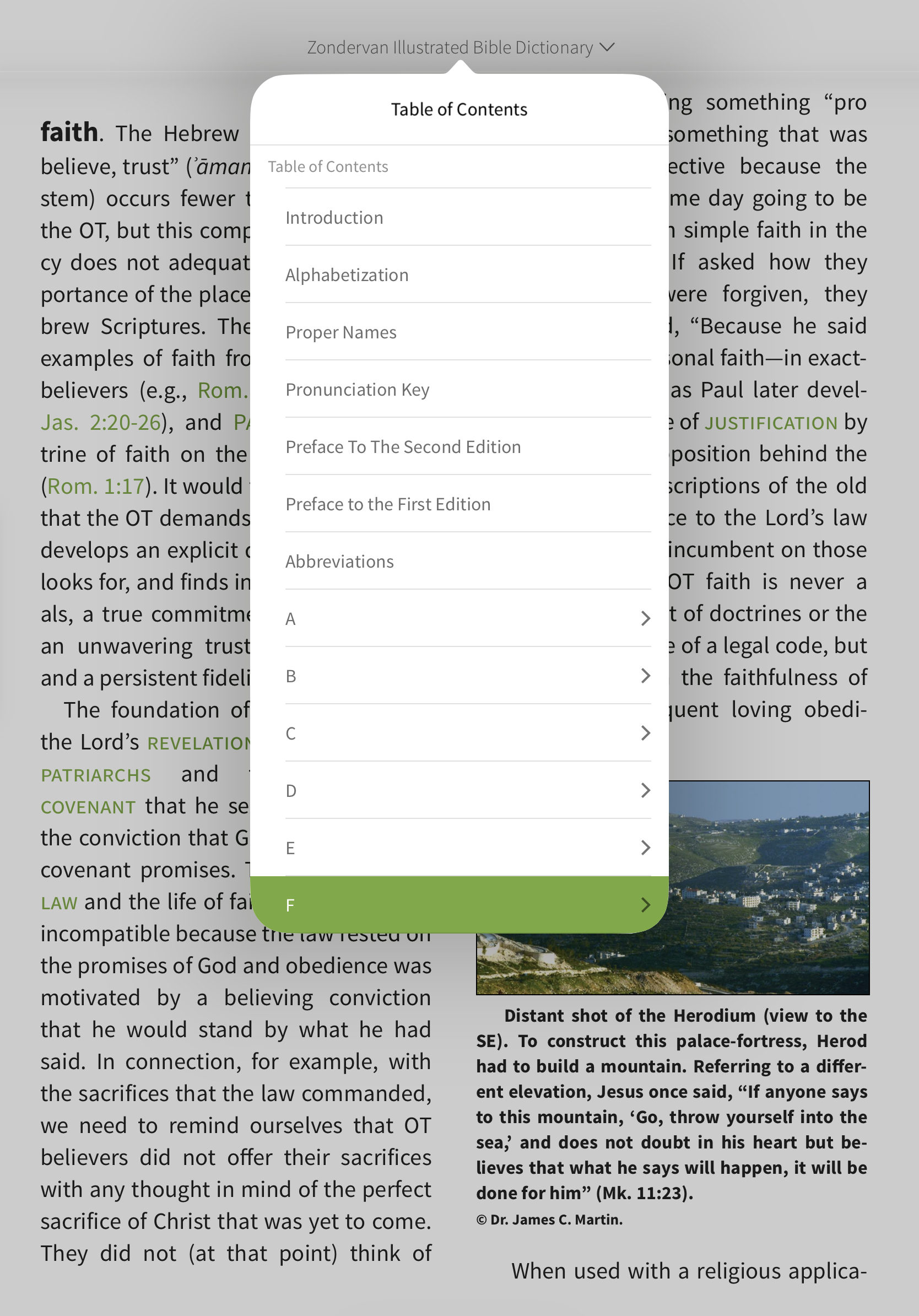 In this Help article, we will go through a few ways to use Bible dictionaries. We will be using the Zondervan Illustrated Bible Dictionary in our iPad app as an example, but these steps should work with any Bible dictionary and will be similar on our other platforms.