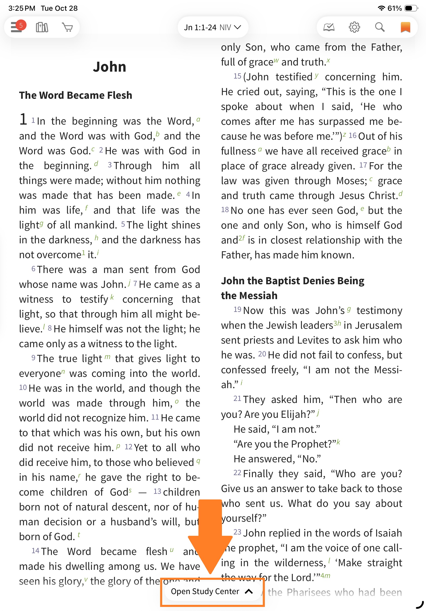 For this example, I have opened the New International Version (NIV) in the main window. You can choose any Bible from your Library. Select the green 'Open Study Center' bar at the bottom of the screen.