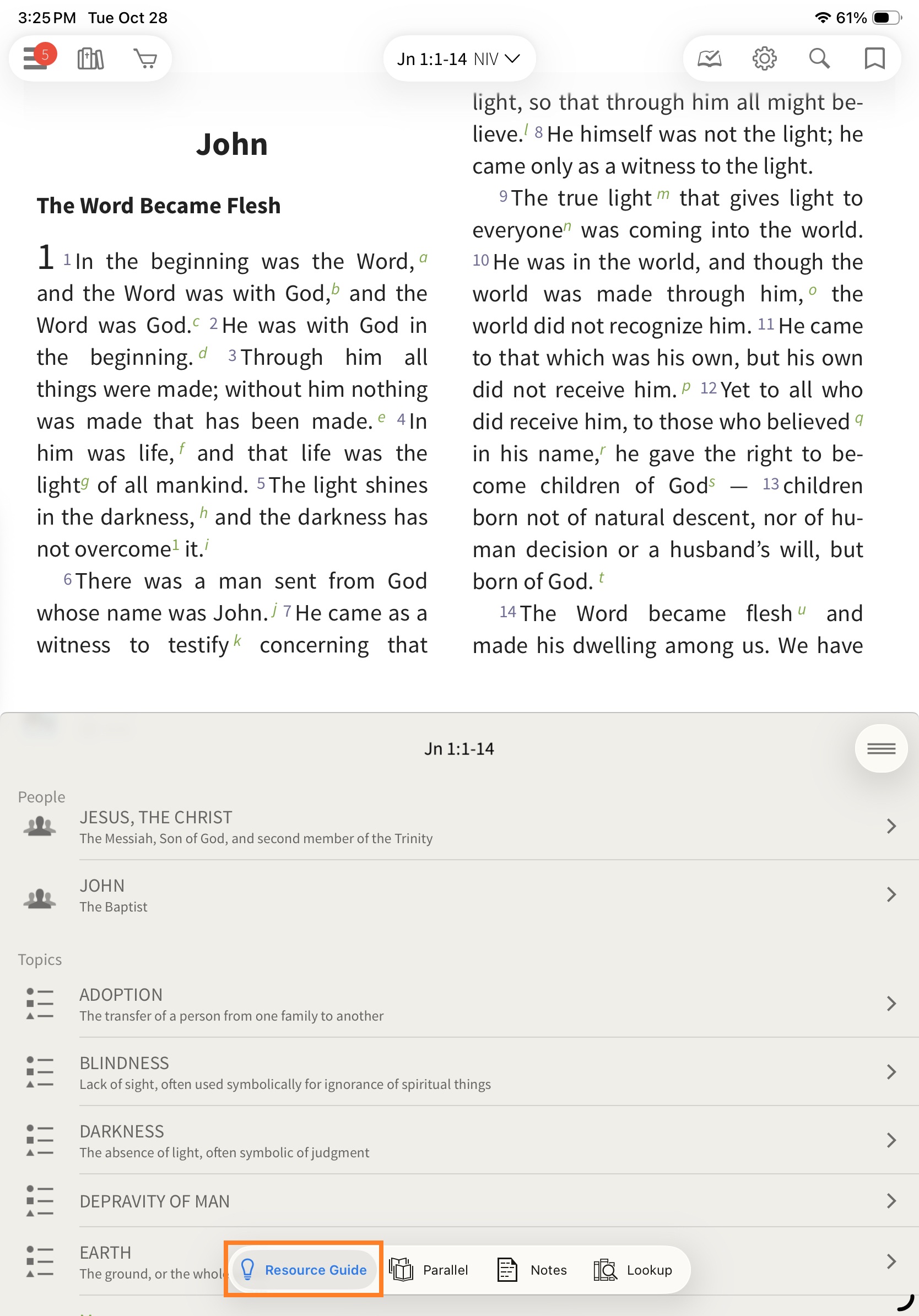 Another way to view a Bible dictionary is in the Resource Guide in the Study Center. As you read through your Bible text, the Resource Guide searches through all the downloaded resources in your Library to find related Bible study content.