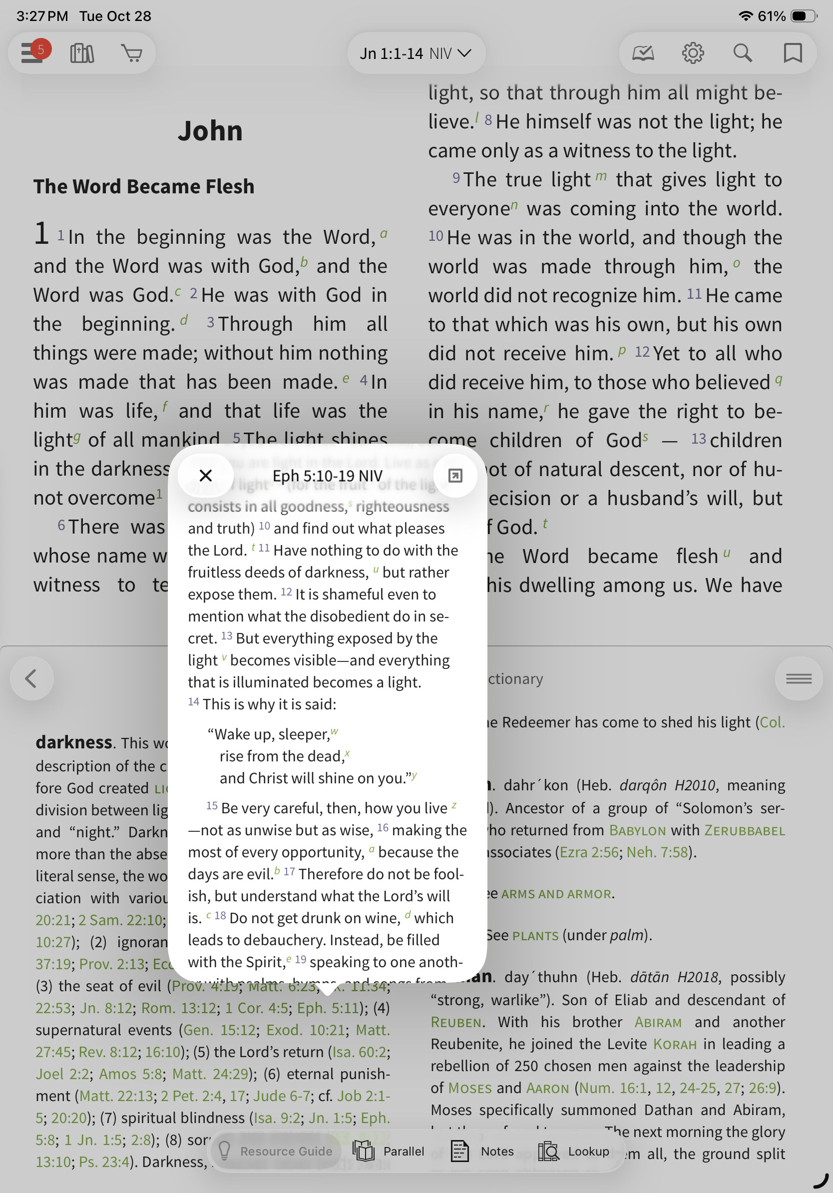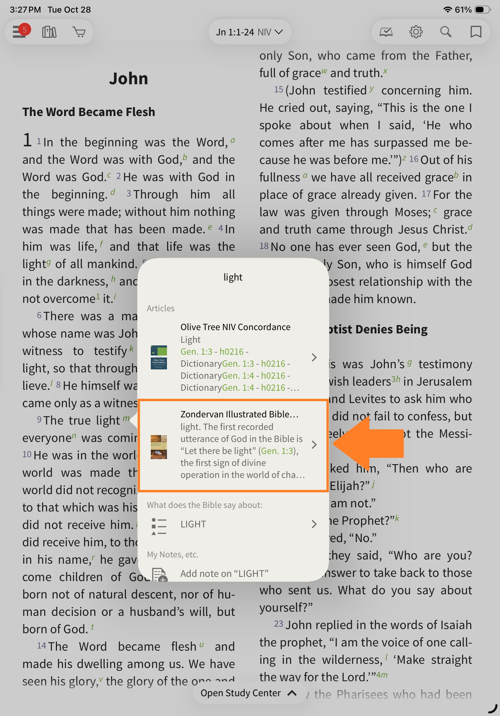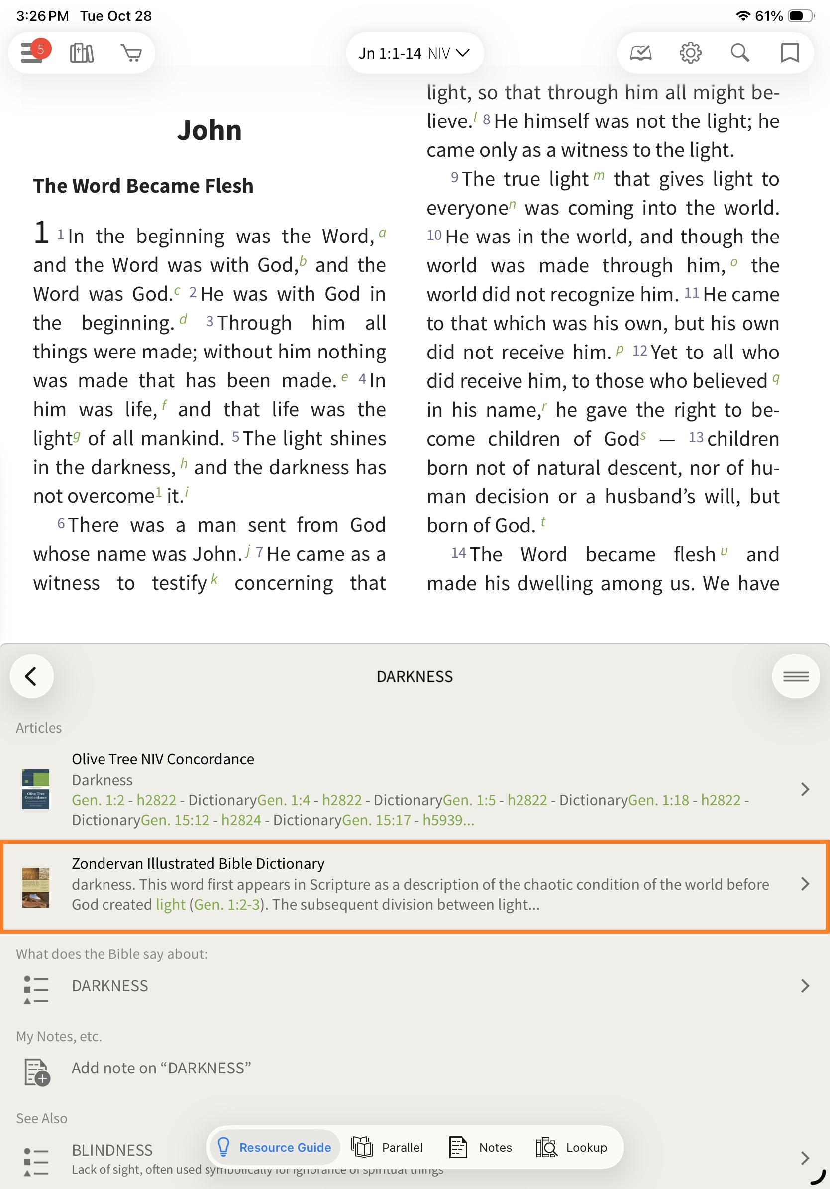 In this example, we have chosen 'DARKNESS' from the Zondervan Illustrated Bible Dictionary in the ' Topics' section.