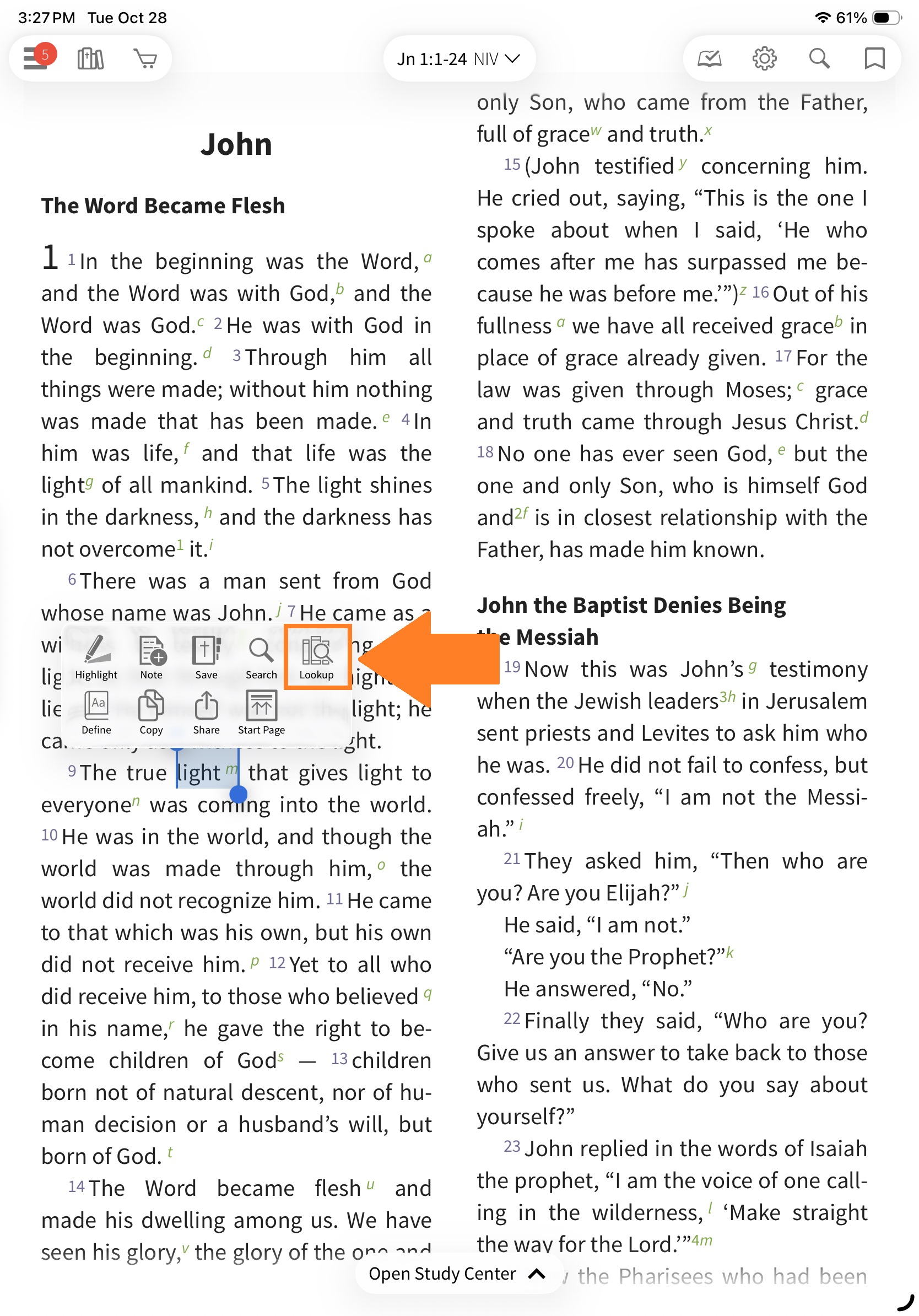 Tap and hold a word in the Bible text and a menu will appear with various options. Tap the 'Lookup' button to get articles from your downloaded dictionaries on that specific word. From here, you can follow the same steps as you would in the Resource Guide option above.