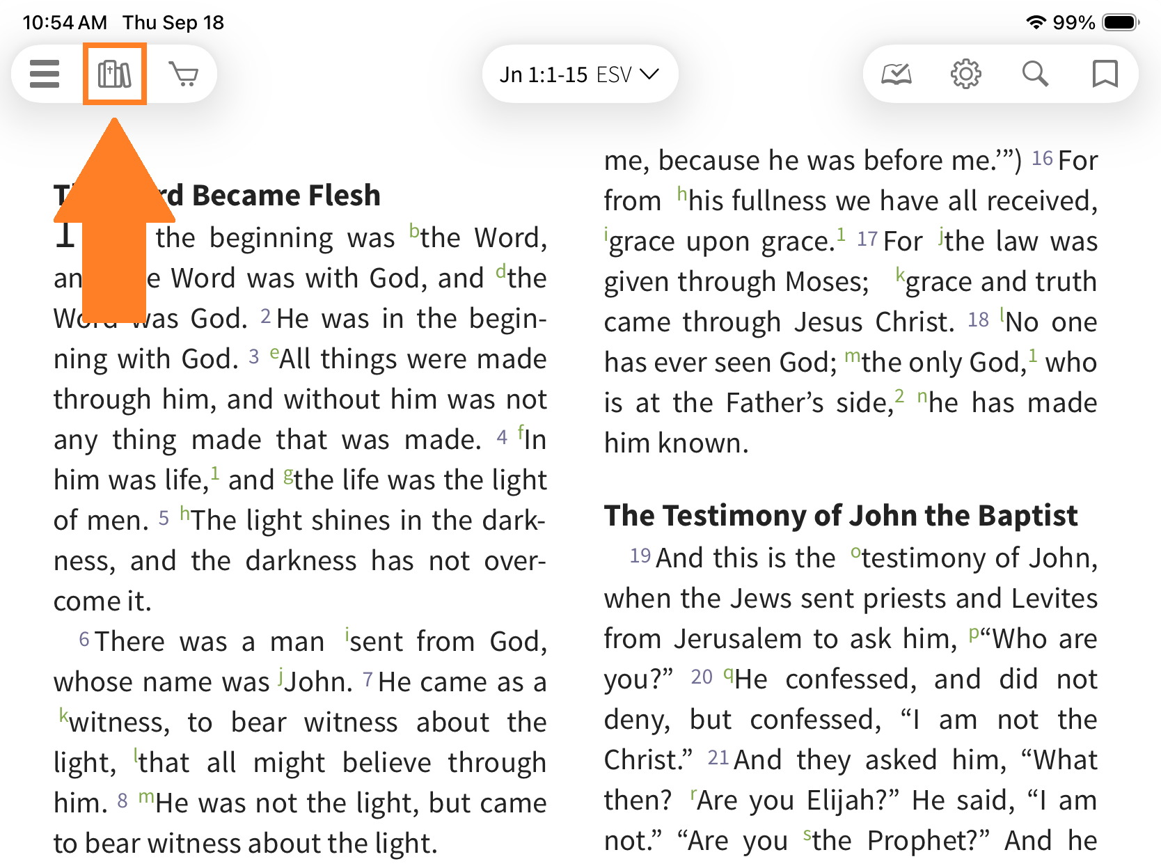 Open the Olive Tree Bible App on your device and tap the Library icon.