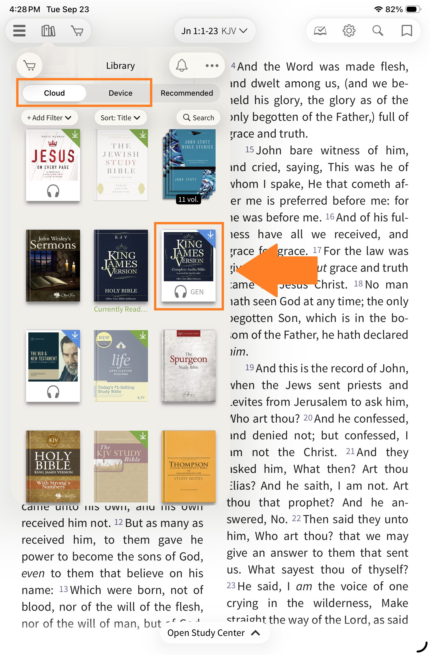 Locate and tap on your Audio Bible in the Library. You can be either on the 'Cloud' or 'Device' tab to access your Audio Bible.