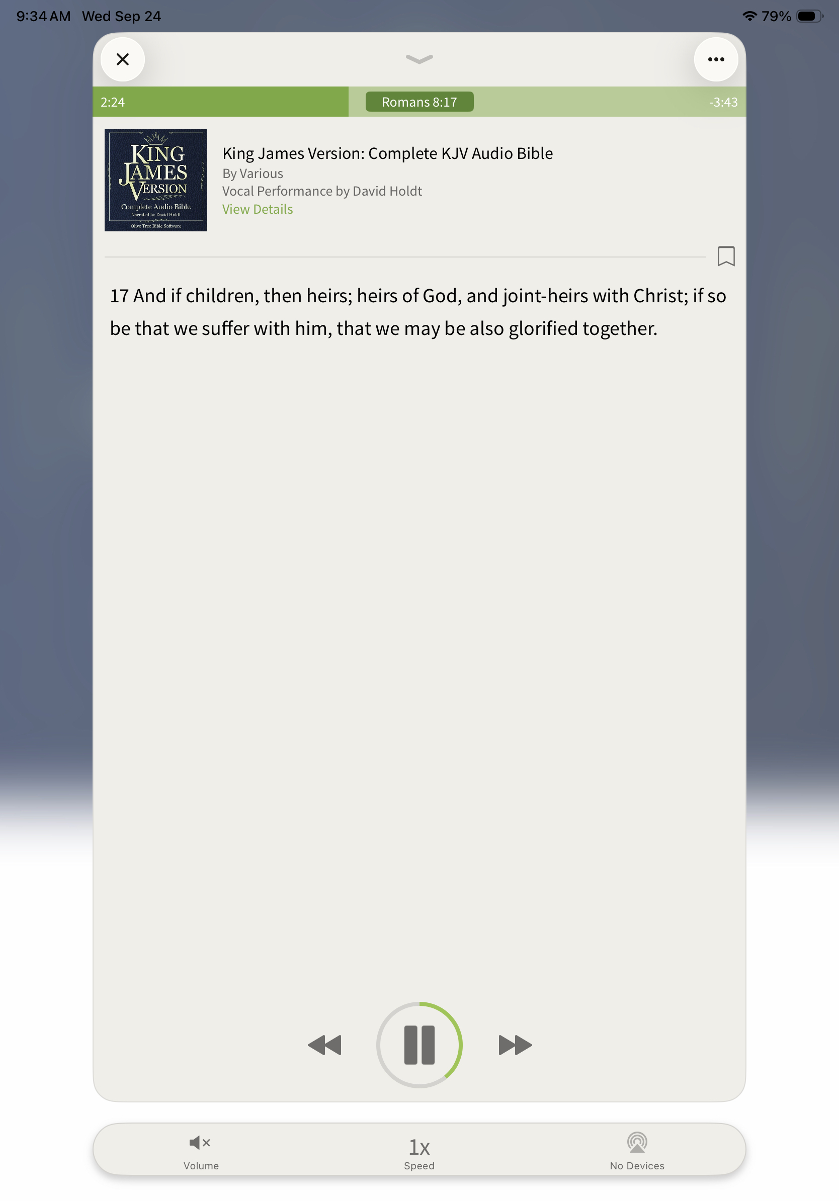 If you have the corresponding Bible text downloaded within the Olive Tree Bible App, you'll note that the text will display in conjunction with the audio, as seen above.