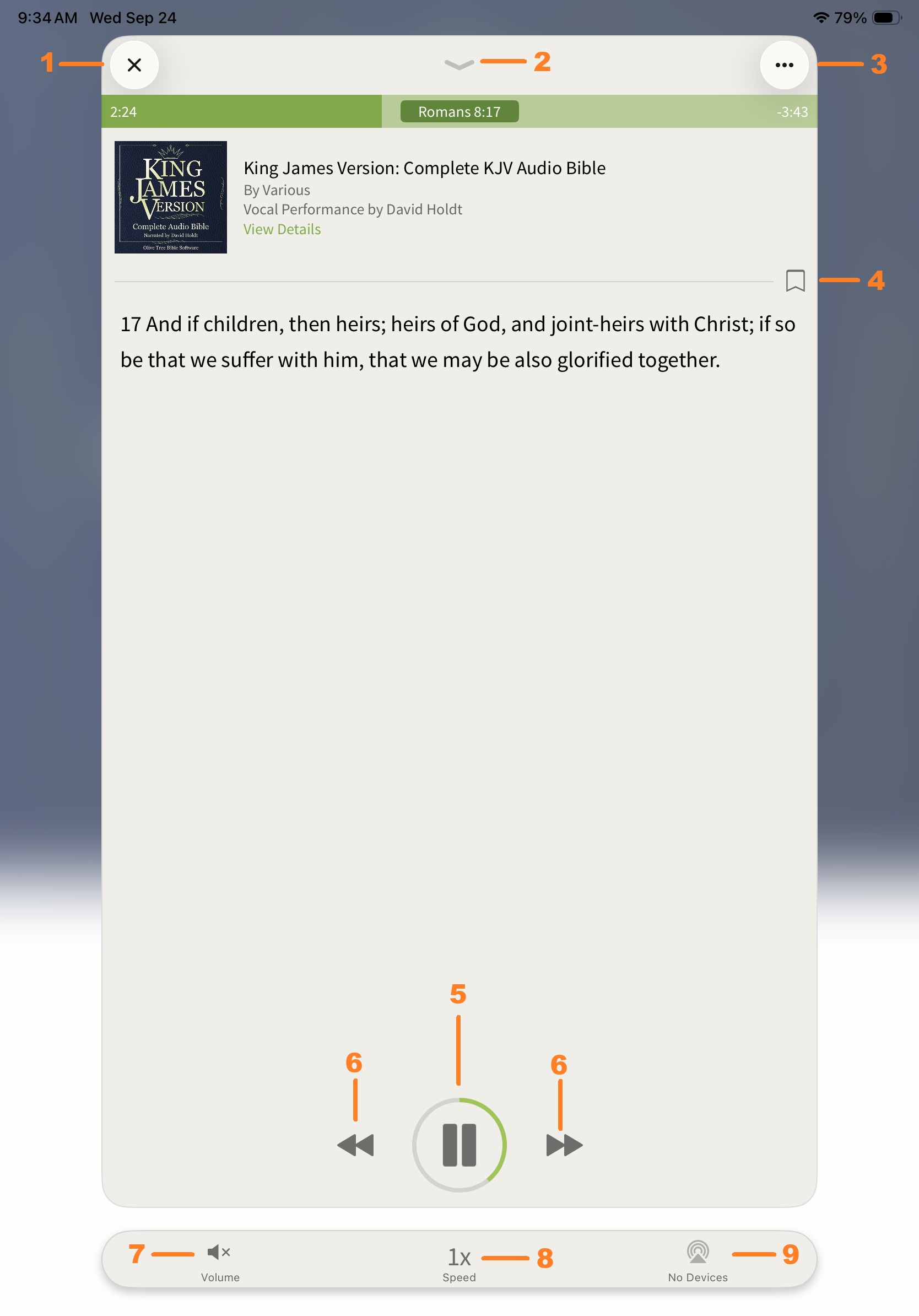 The features of the audio Bible are found on the Audio Player screen. Each feature on this screen has been circled with a number so you can learn what each feature does.