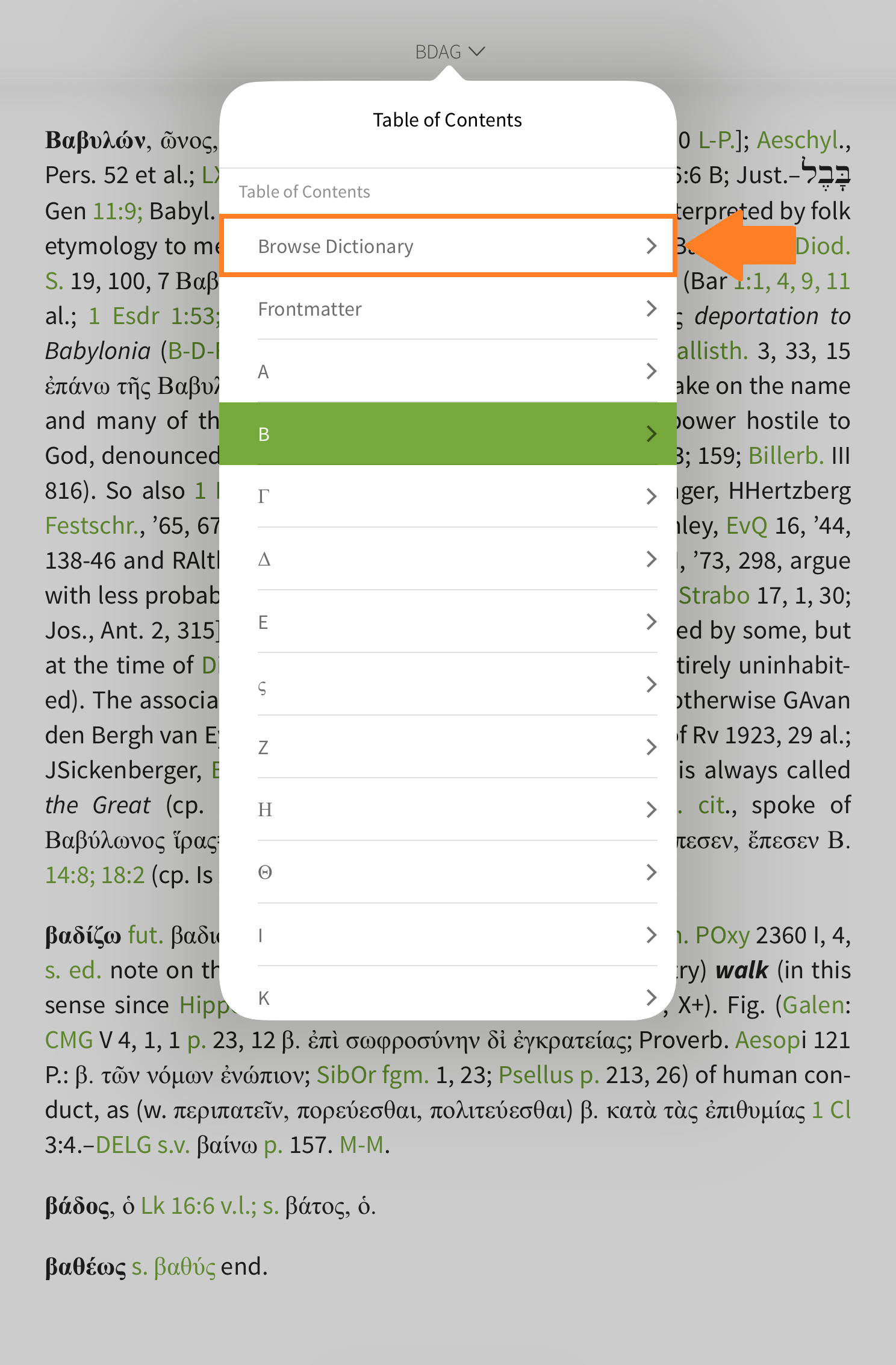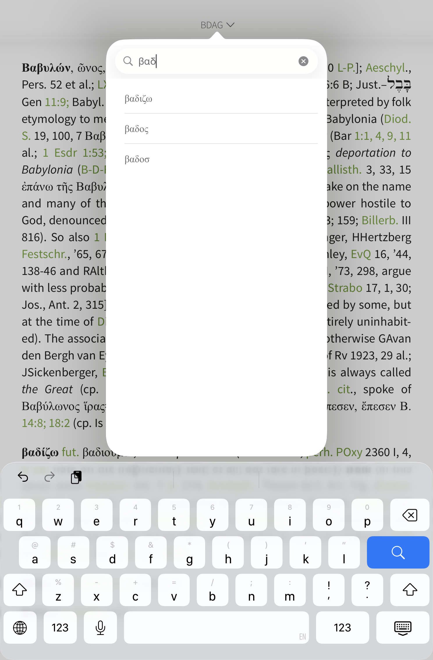 You will now see any articles from your Greek dictionaries that are related to the word you looked up. Tap your dictionary's book cover and you can read the article on the Greek word in the pop-up window.
