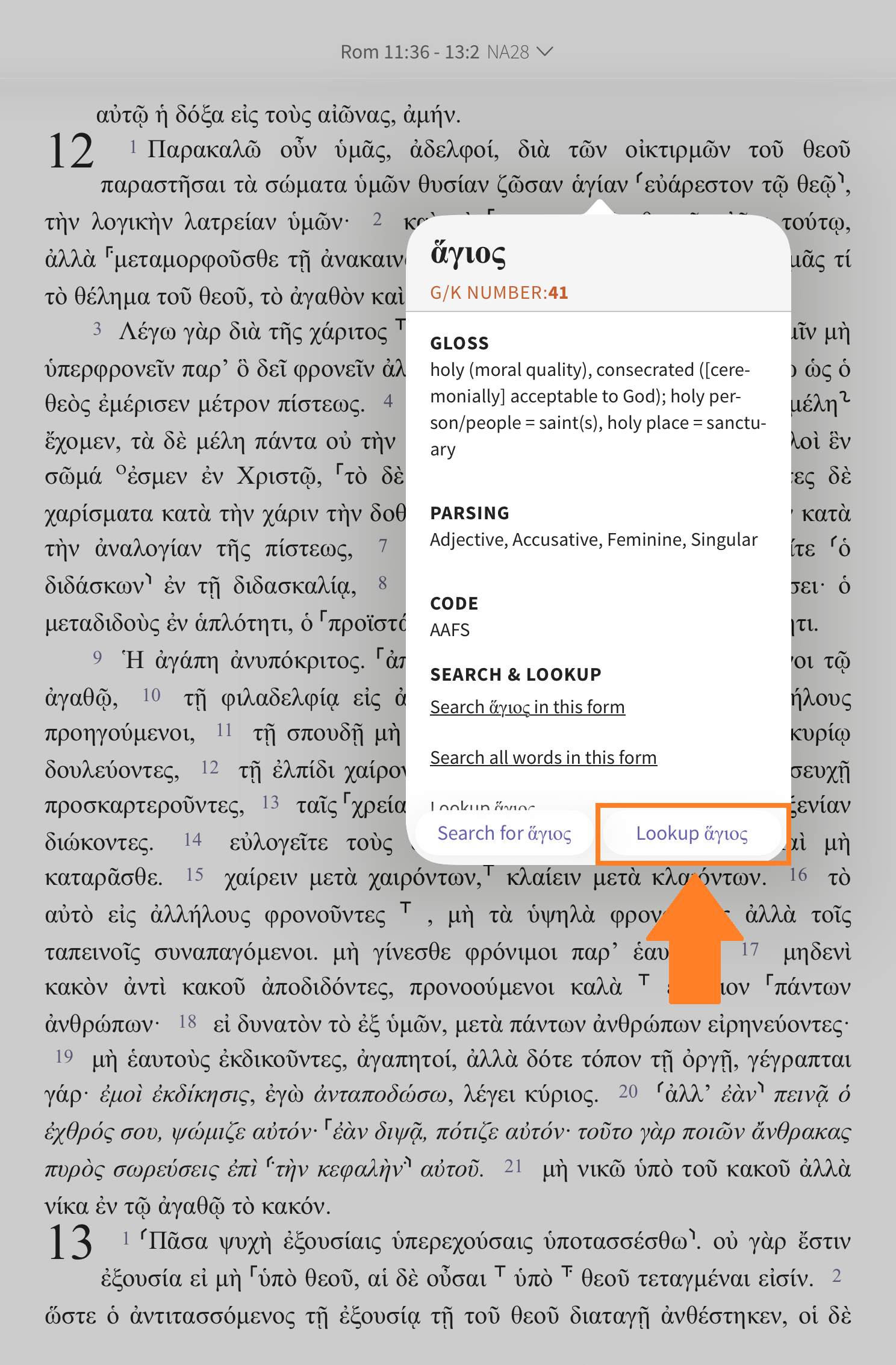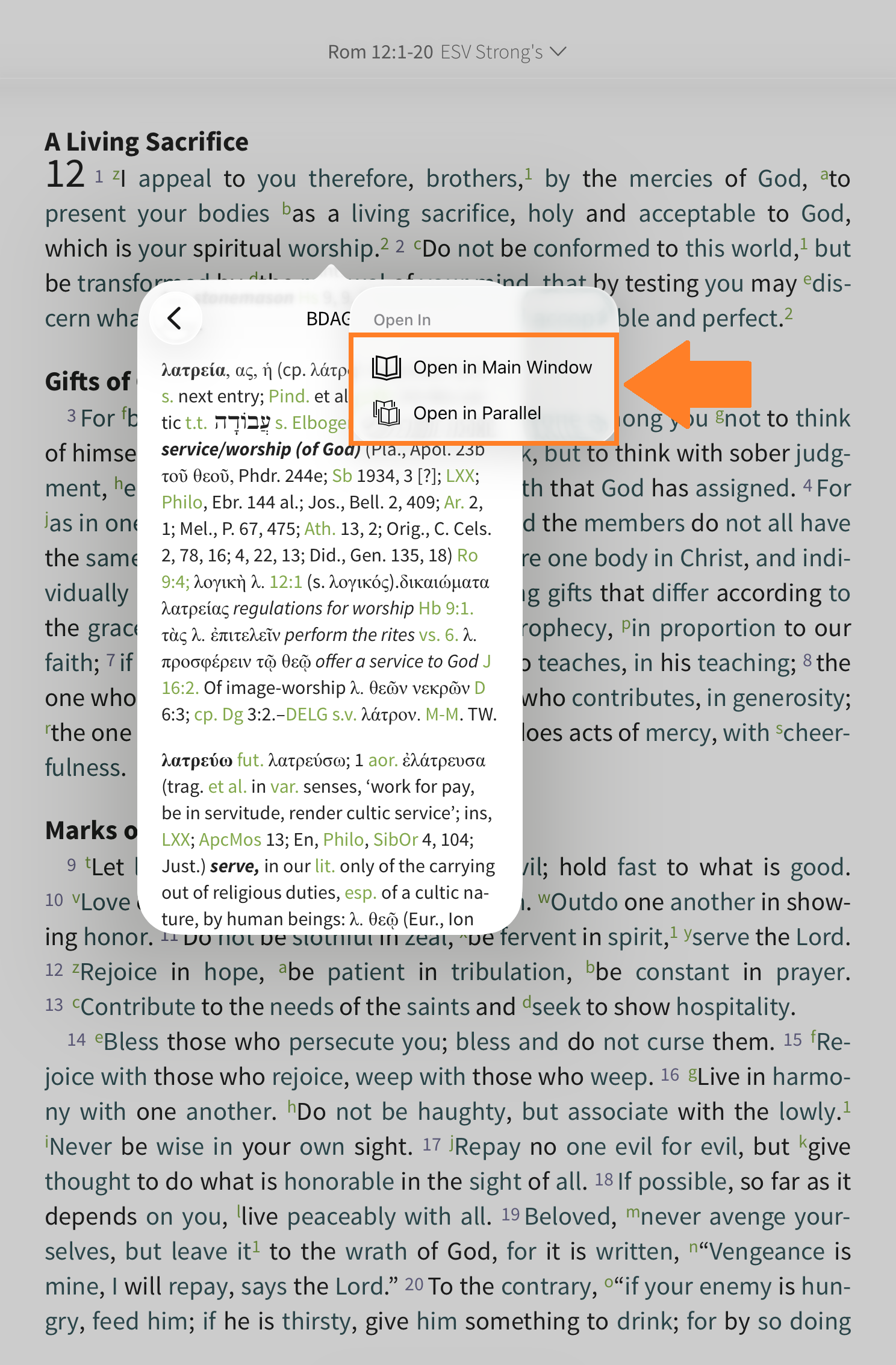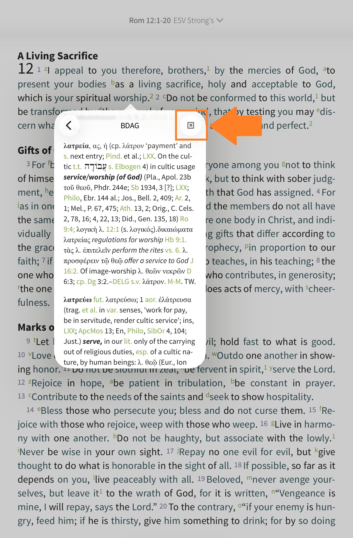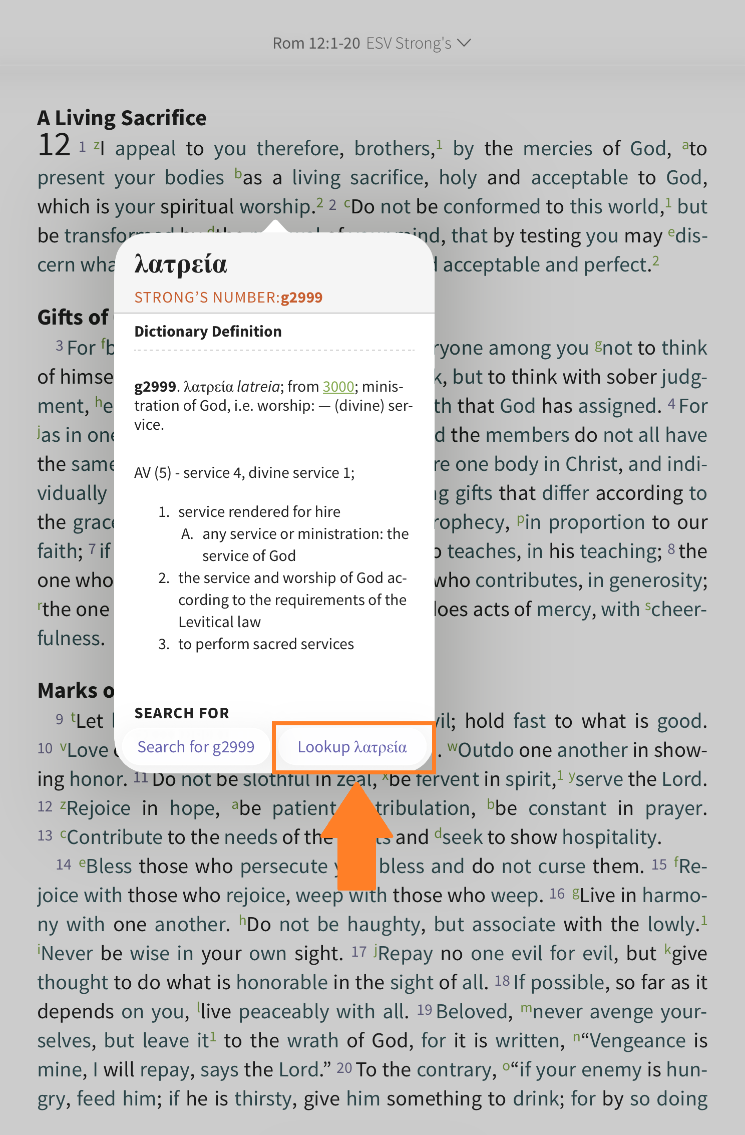 Tap the word you want to learn more about in the Strong's text. In this example, we tapped on 'worship' in Romans 12:1. From the Strong’s pop-up window, tap 'Lookup [Greek word]'.