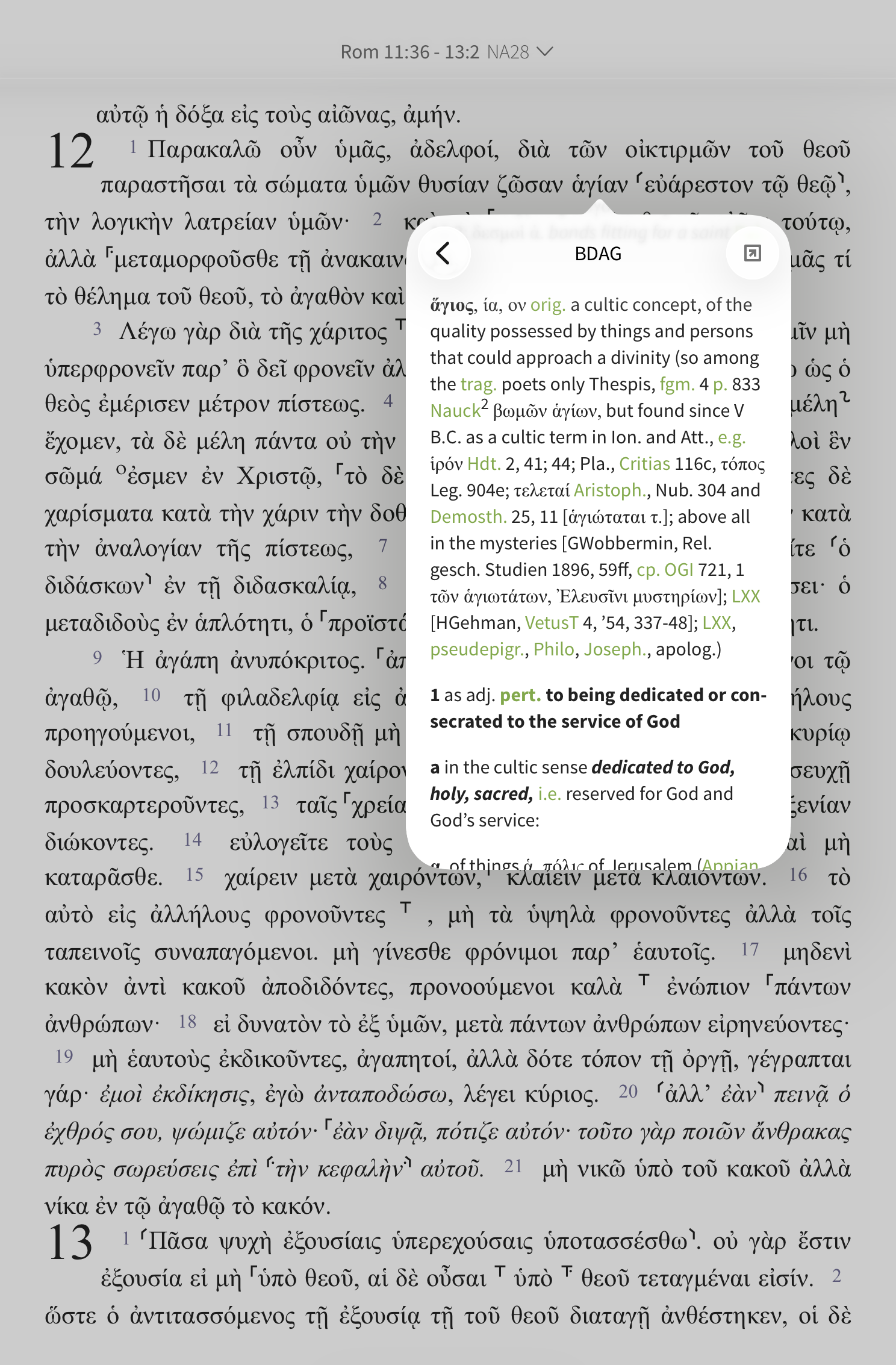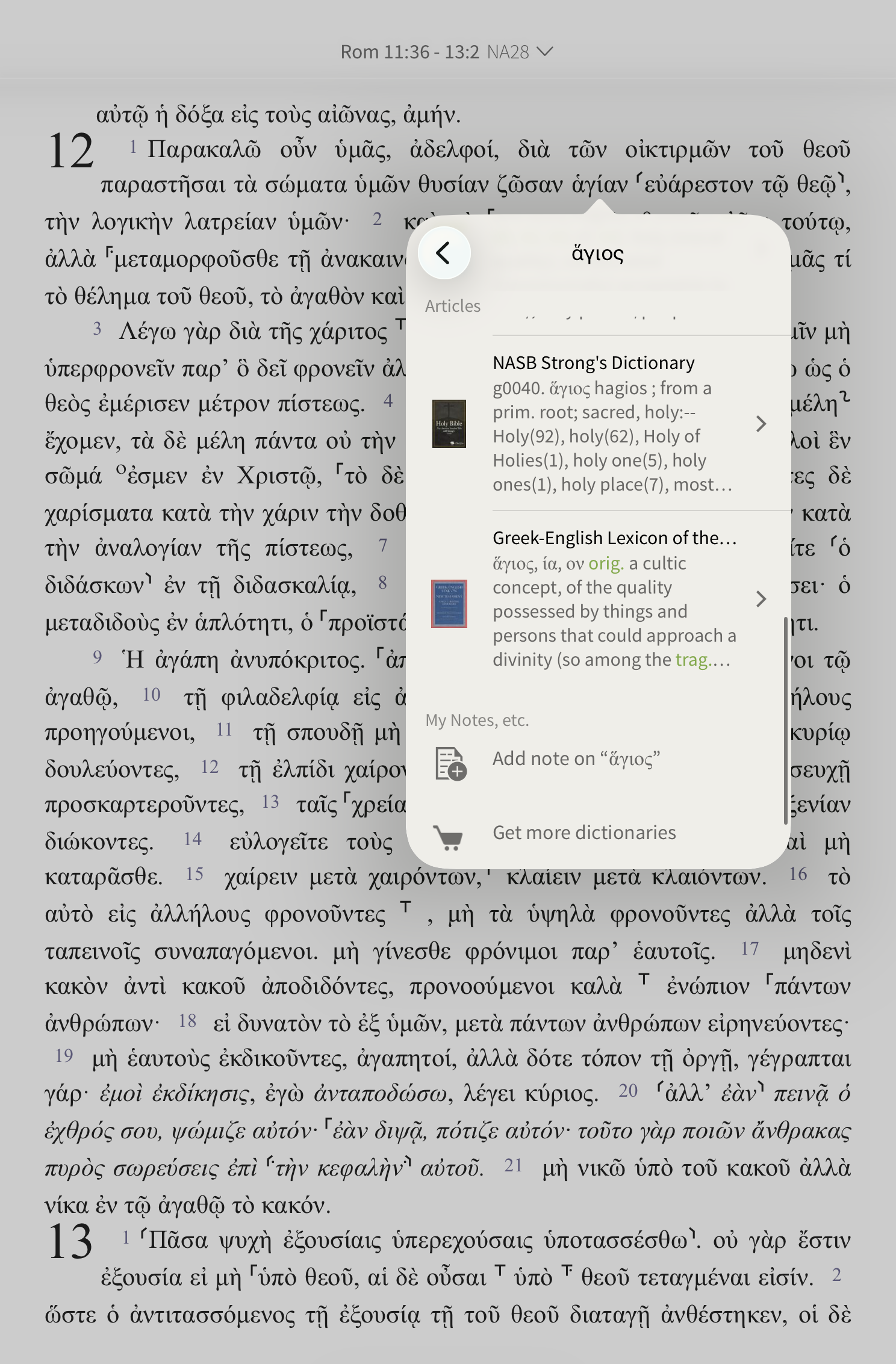 Along the same lines, Greek parsed texts like the NA28 with Parsings work very well with Greek dictionaries. Open the NA28 or another Greek text with Parsings from the Library and tap on a word.