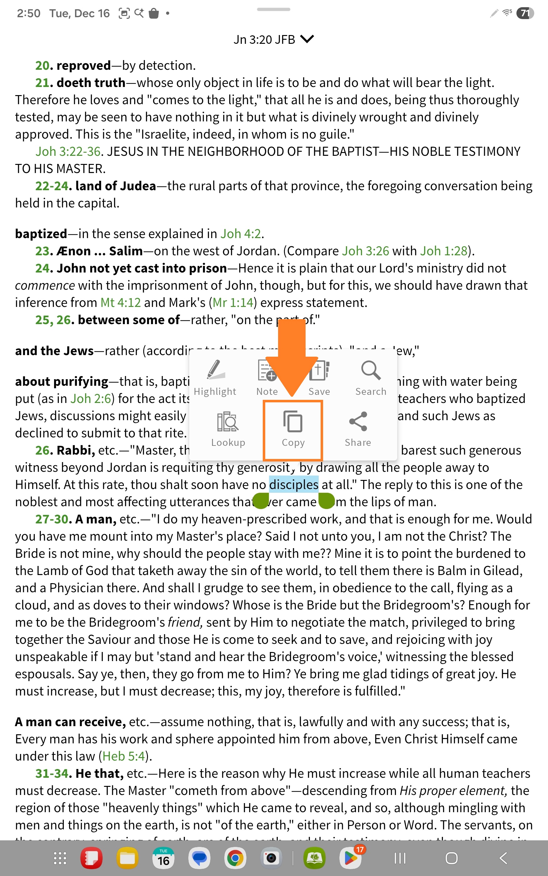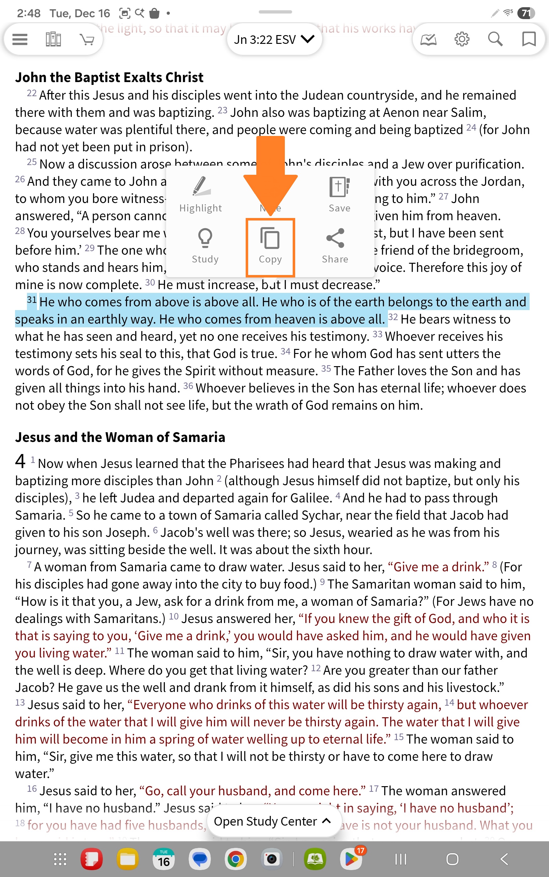 If you wish to copy multiple Bible verses, use the right arrow to select more verses: