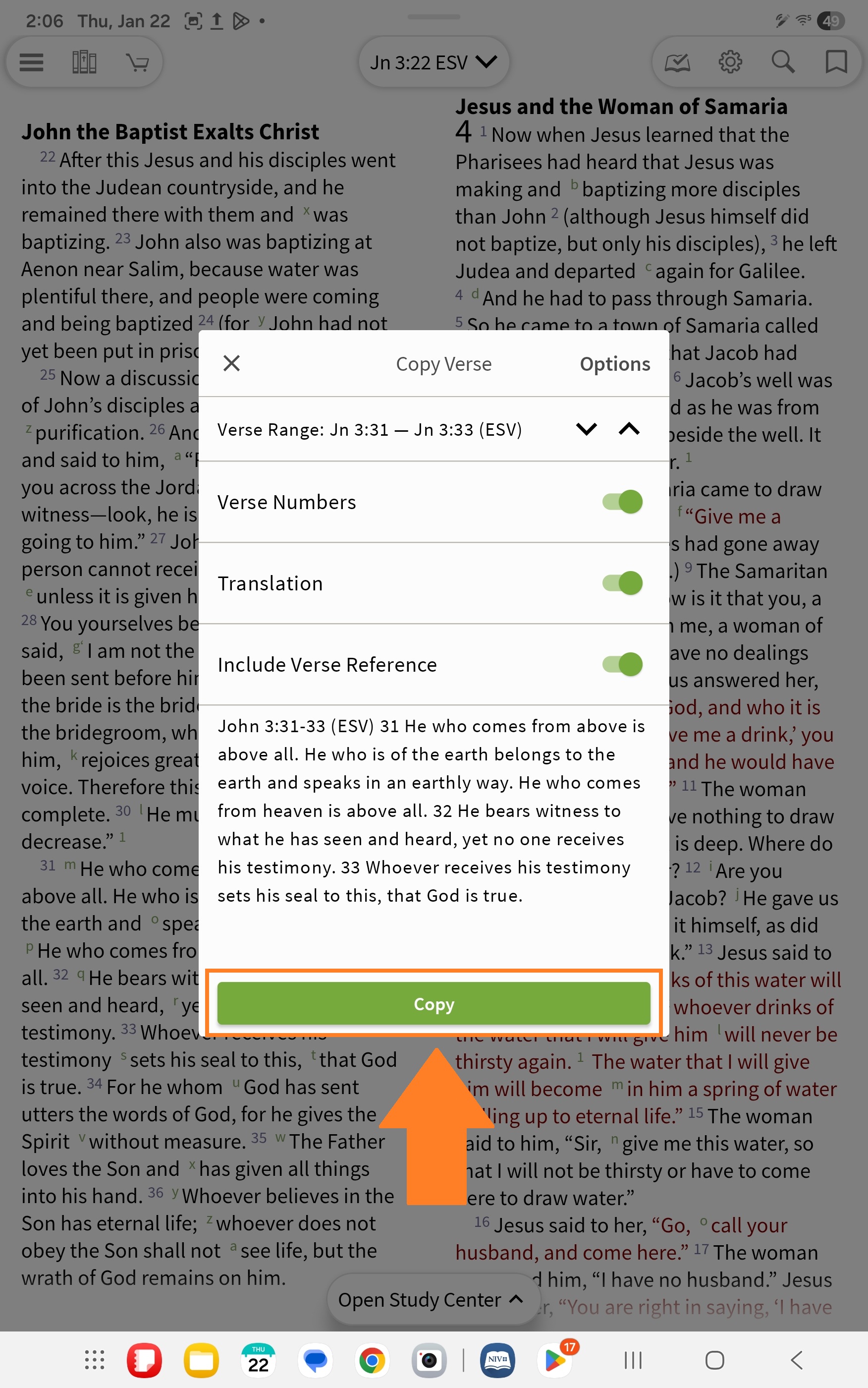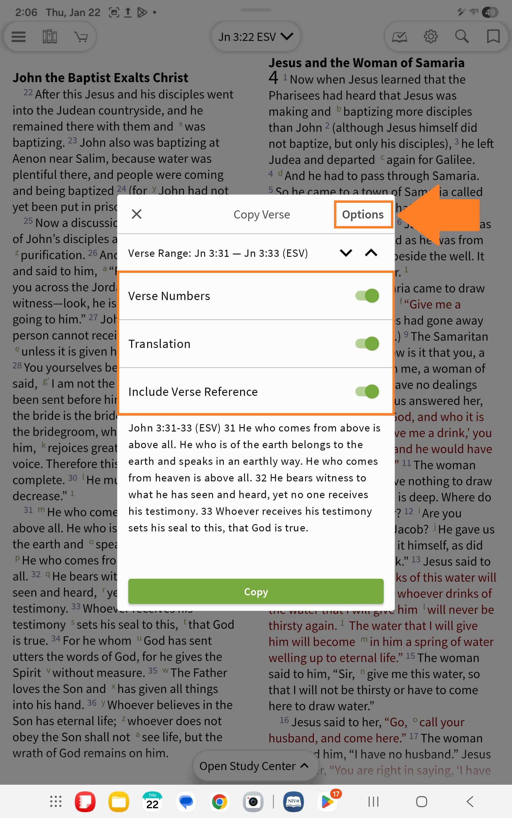 Toggle 'Verse Numbers', 'Translation', and 'Include Verse Reference' On/Off to customize. Note that as you toggle the switches, you will see a preview of how the text will paste. These choices are temporary and will reset the next time you copy, unless you update them in Copy Verse Settings using the steps above.