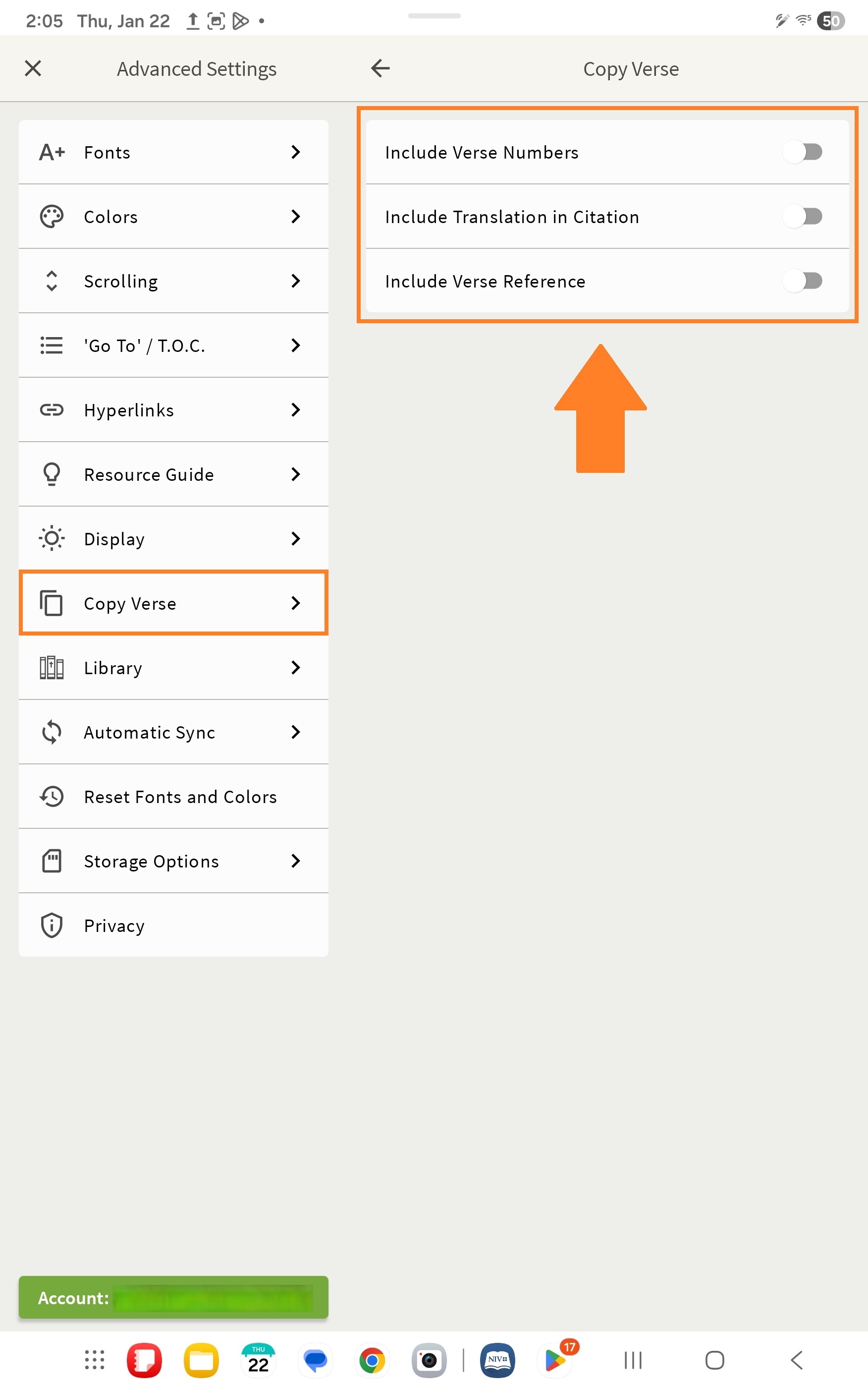 'Verse Numbers,' 'Translation,' and 'Include Verse Reference' ON: