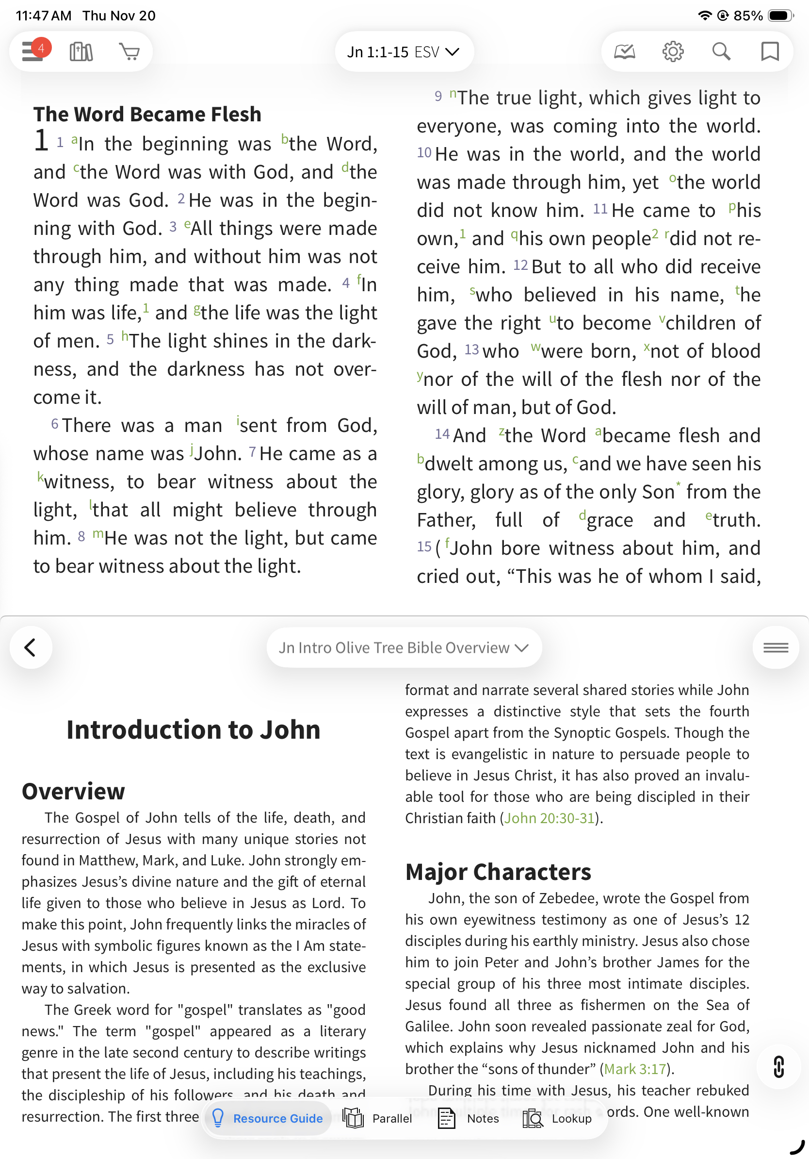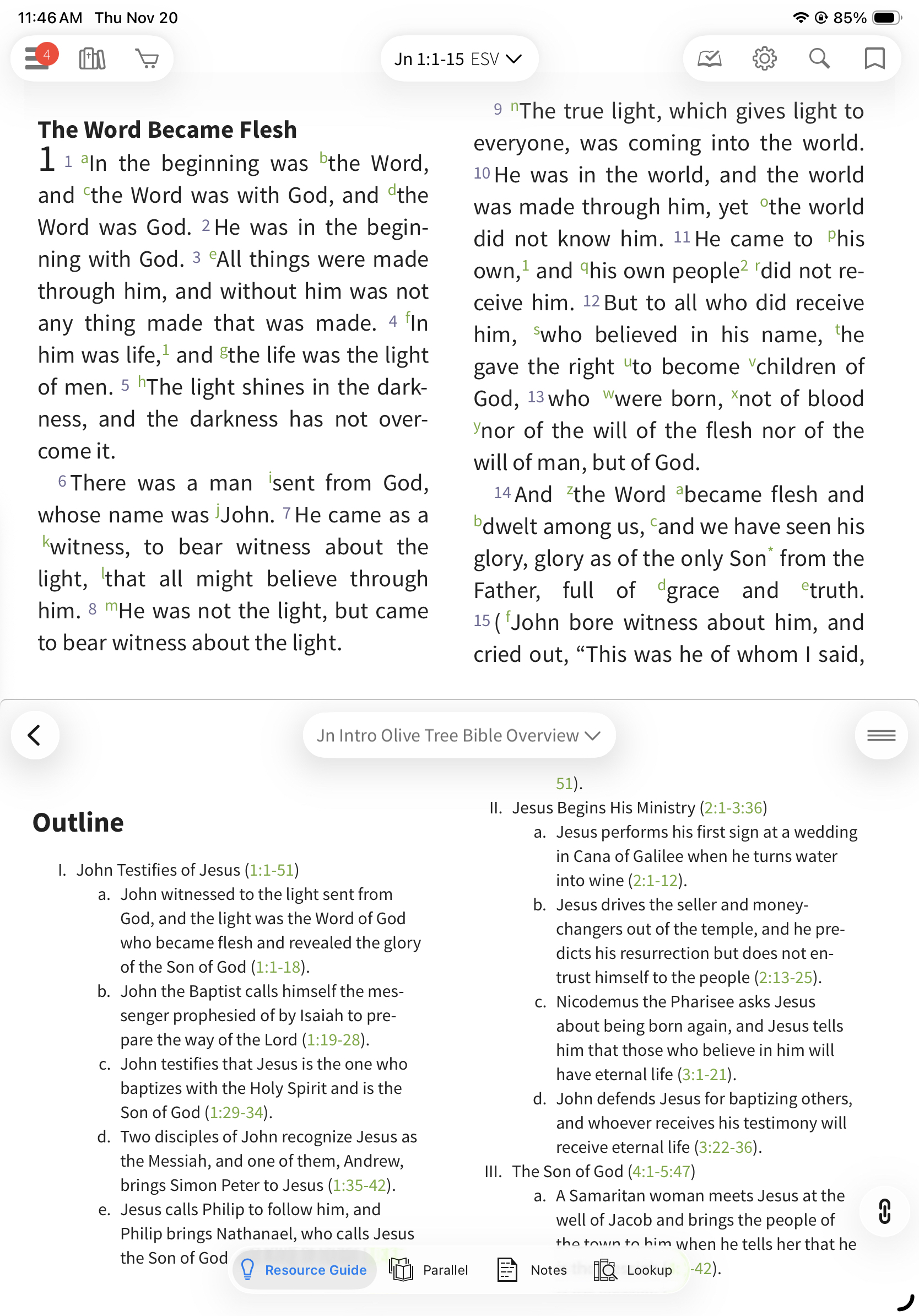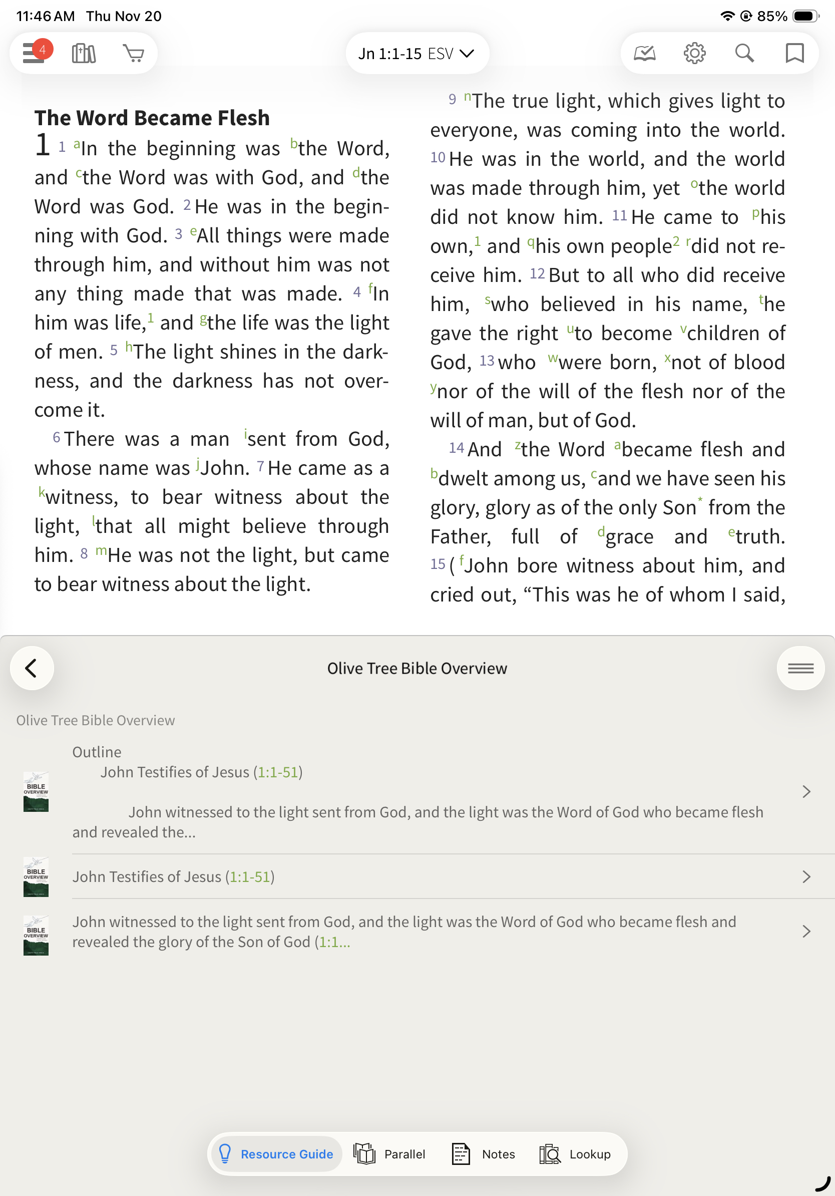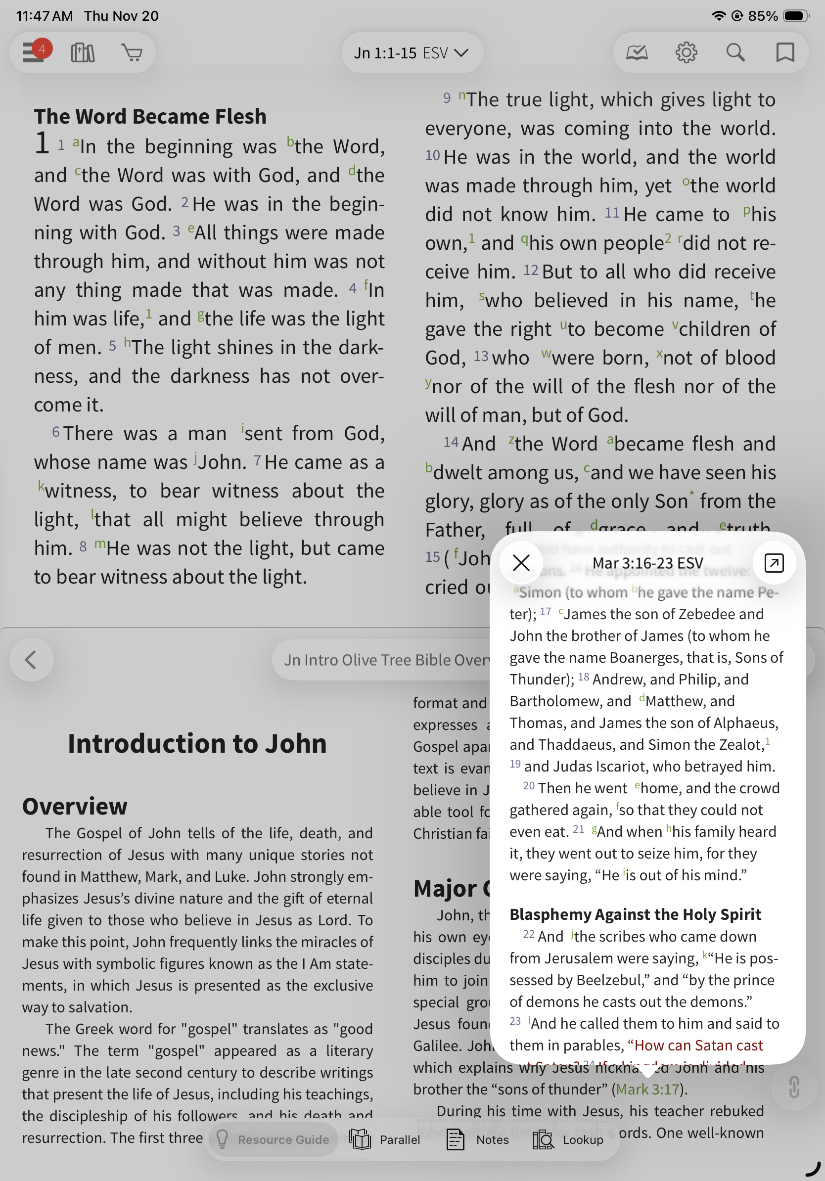 Another feature of the Olive Tree Bible Overview is linked verses! As you scroll through and see Scripture references, you can tap on a reference to see the passage in a pop-up window.