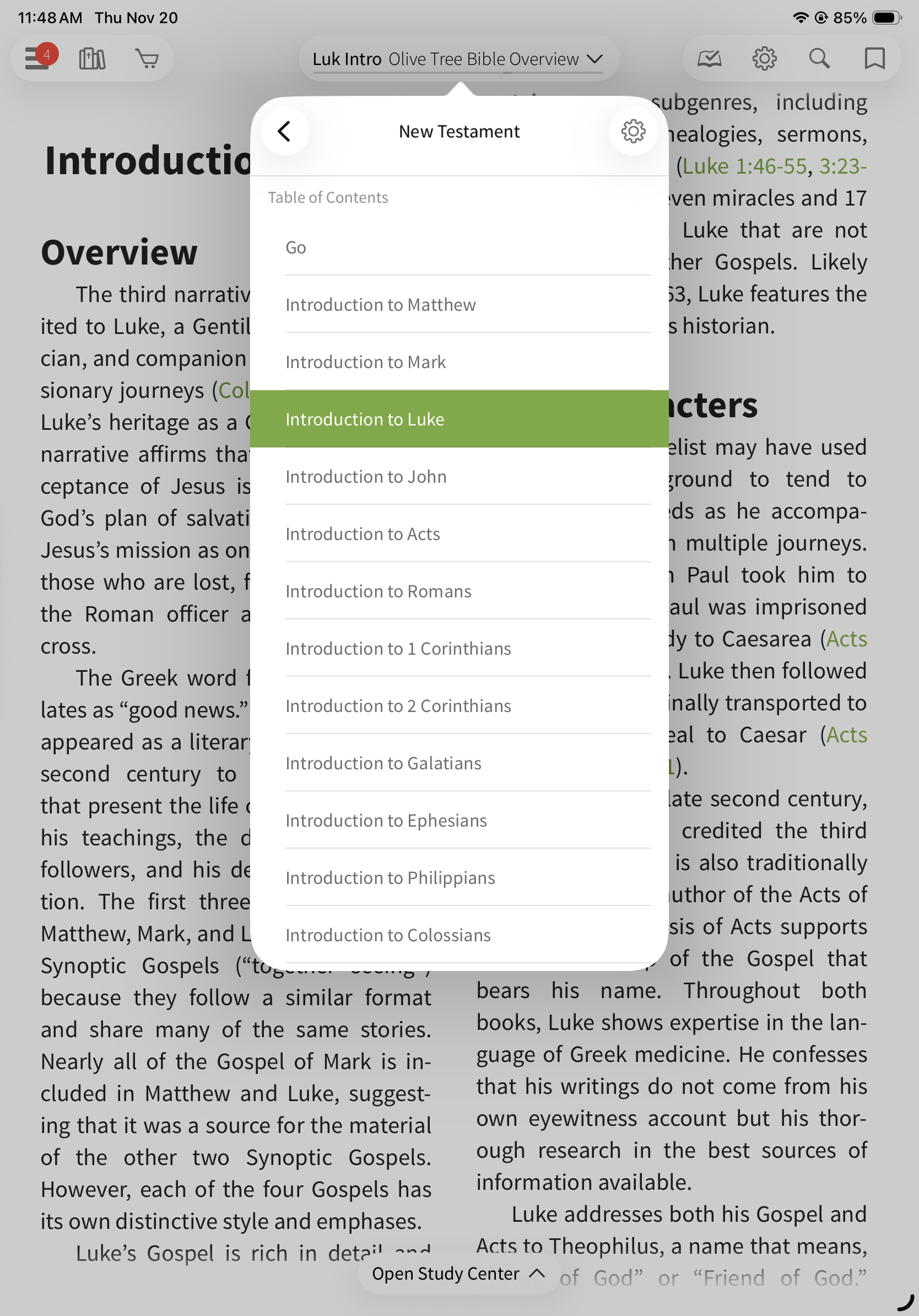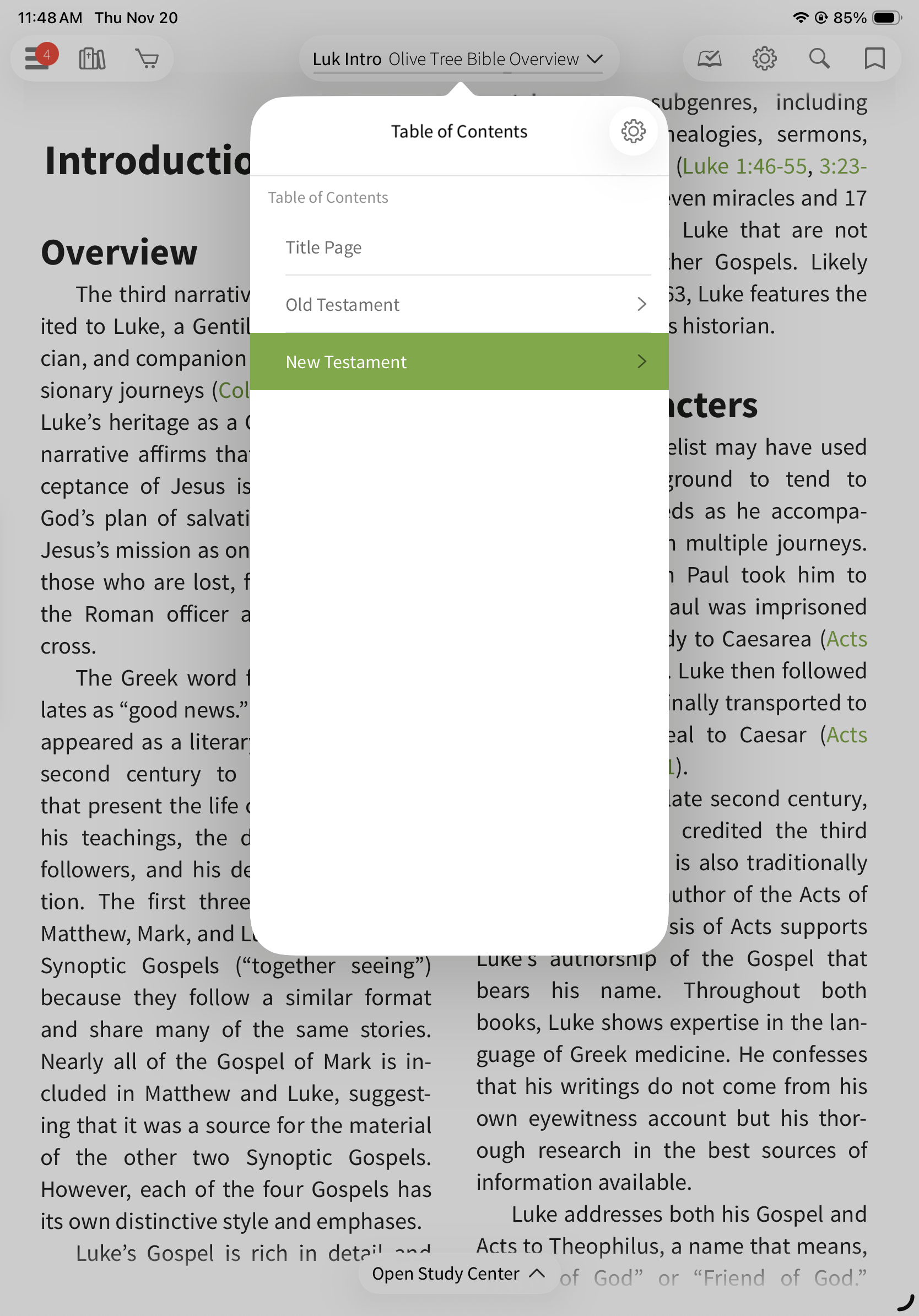 This option will allow you to navigate into the Table of Contents for the Olive Tree Bible Overview. To access the Table of Contents, tap on the navigation menu.