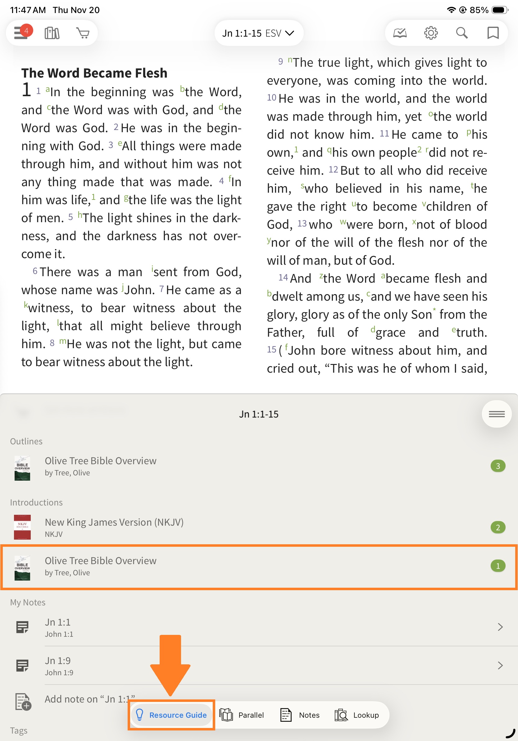 Next, select the 'Resource Guide' tab (lightbulb icon) to make sure you have the Resource Guide open. By scrolling down, you will be able to see all entries in the Olive Tree Bible Overview that are related to the text you are viewing in the main window.