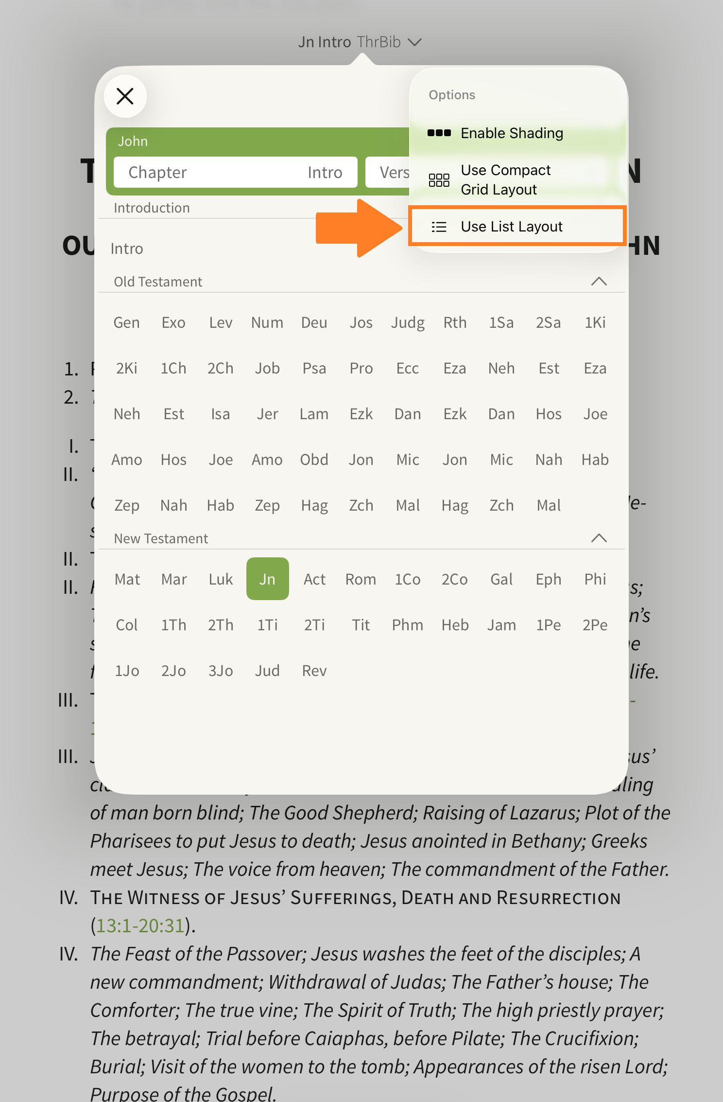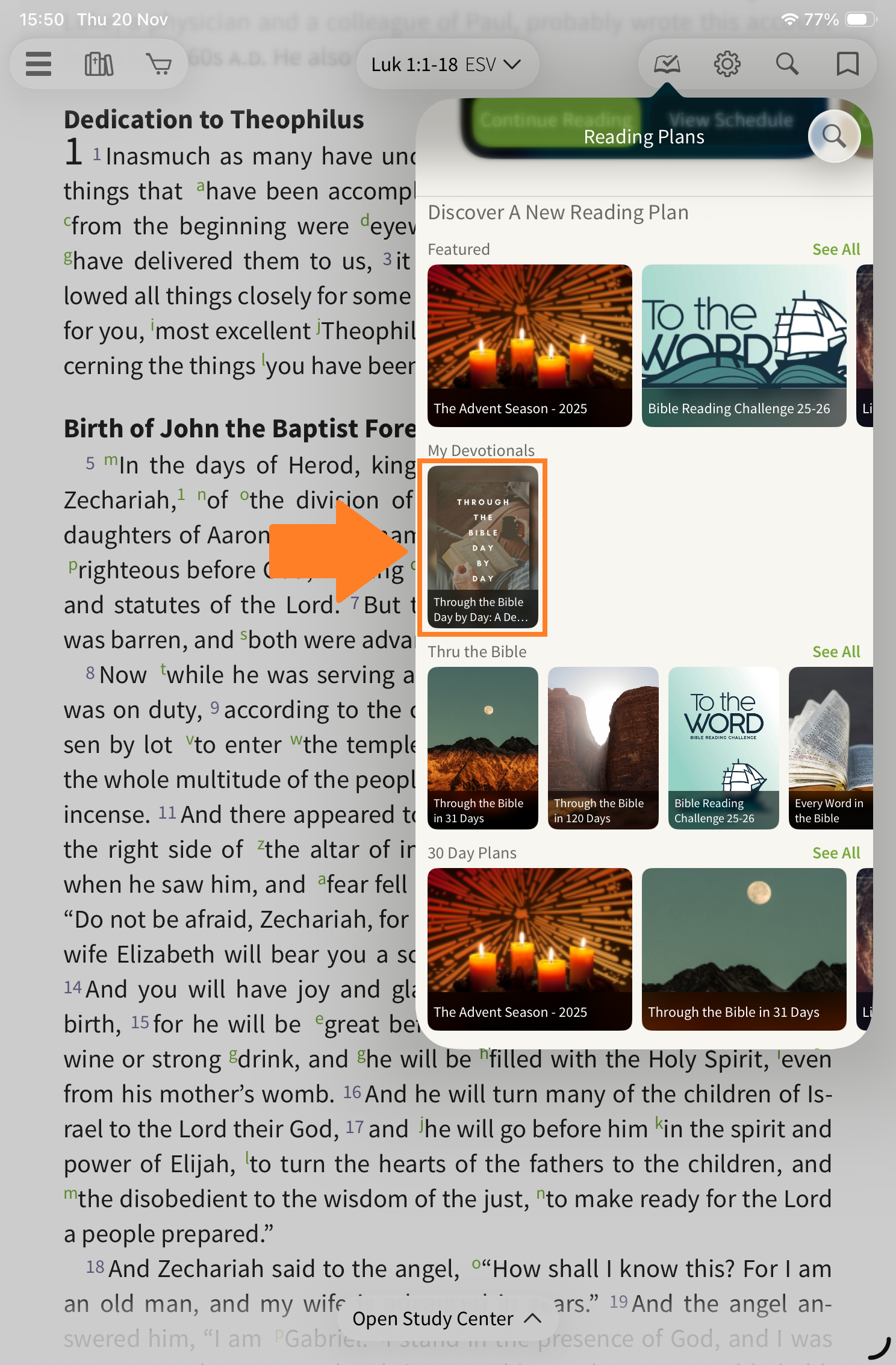 Another way to use Through the Bible Day by Day is as a devotional. To start, tap the reading plan icon at the top of the screen: