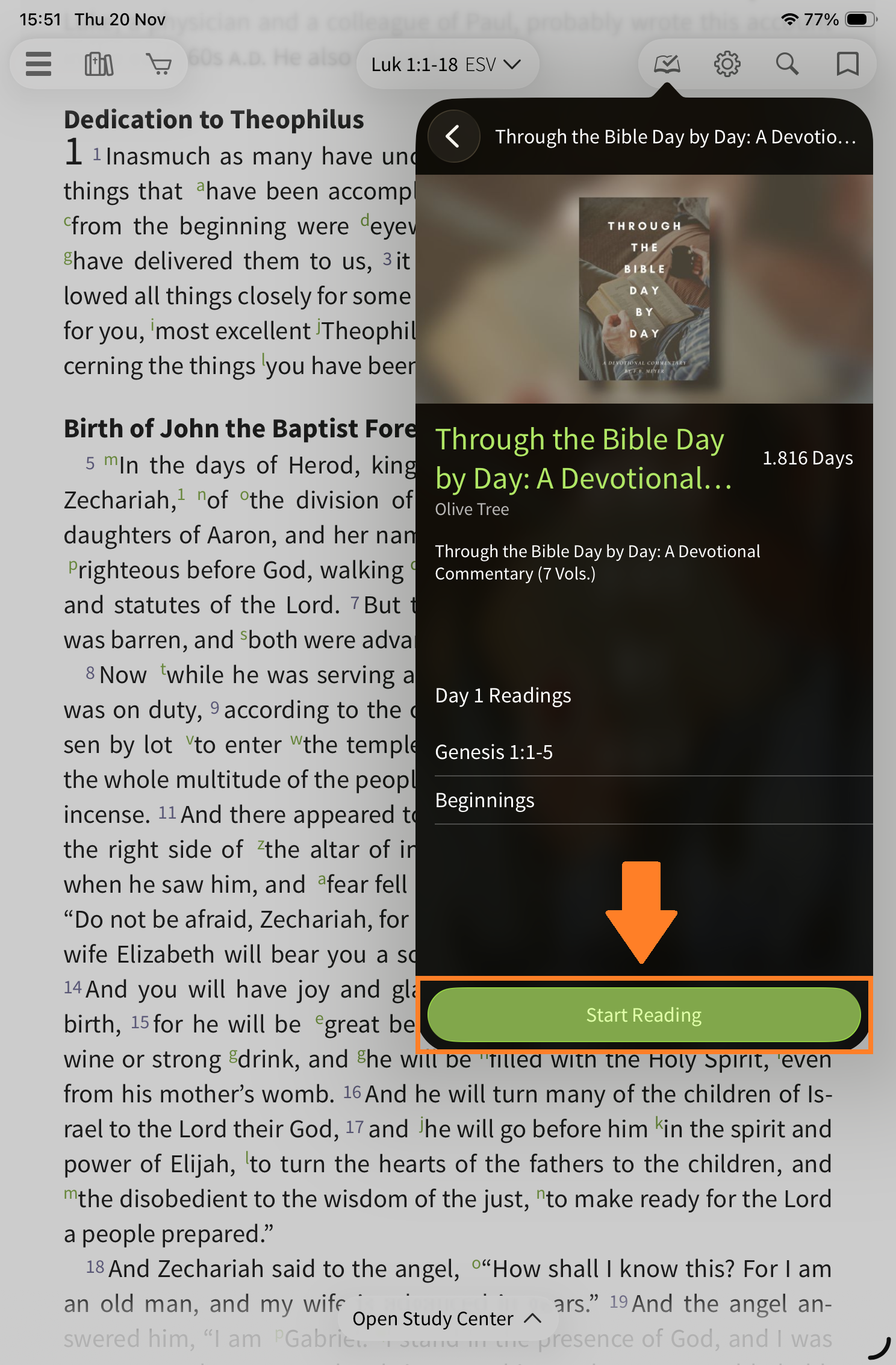 You will see that the Olive Tree Bible App automatically divides the commentary into daily readings with a Scripture passage and a commentary excerpt for each day. Tap 'Start Reading' to set up the devotional as a scheduled daily plan.