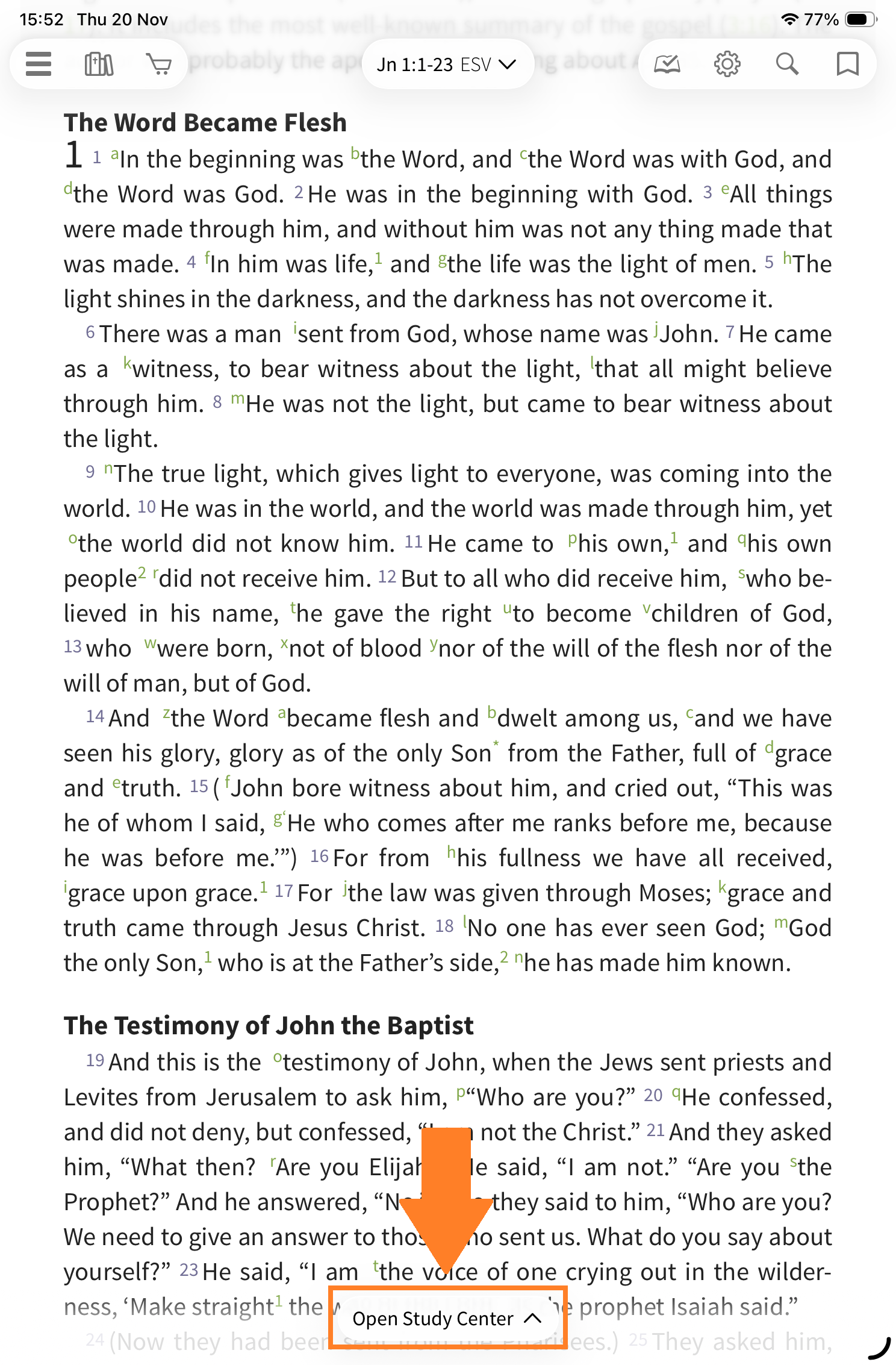 You can also open your preferred Bible translation in the main window and the Resource Guide in the Study Center. First, open the Study Center: