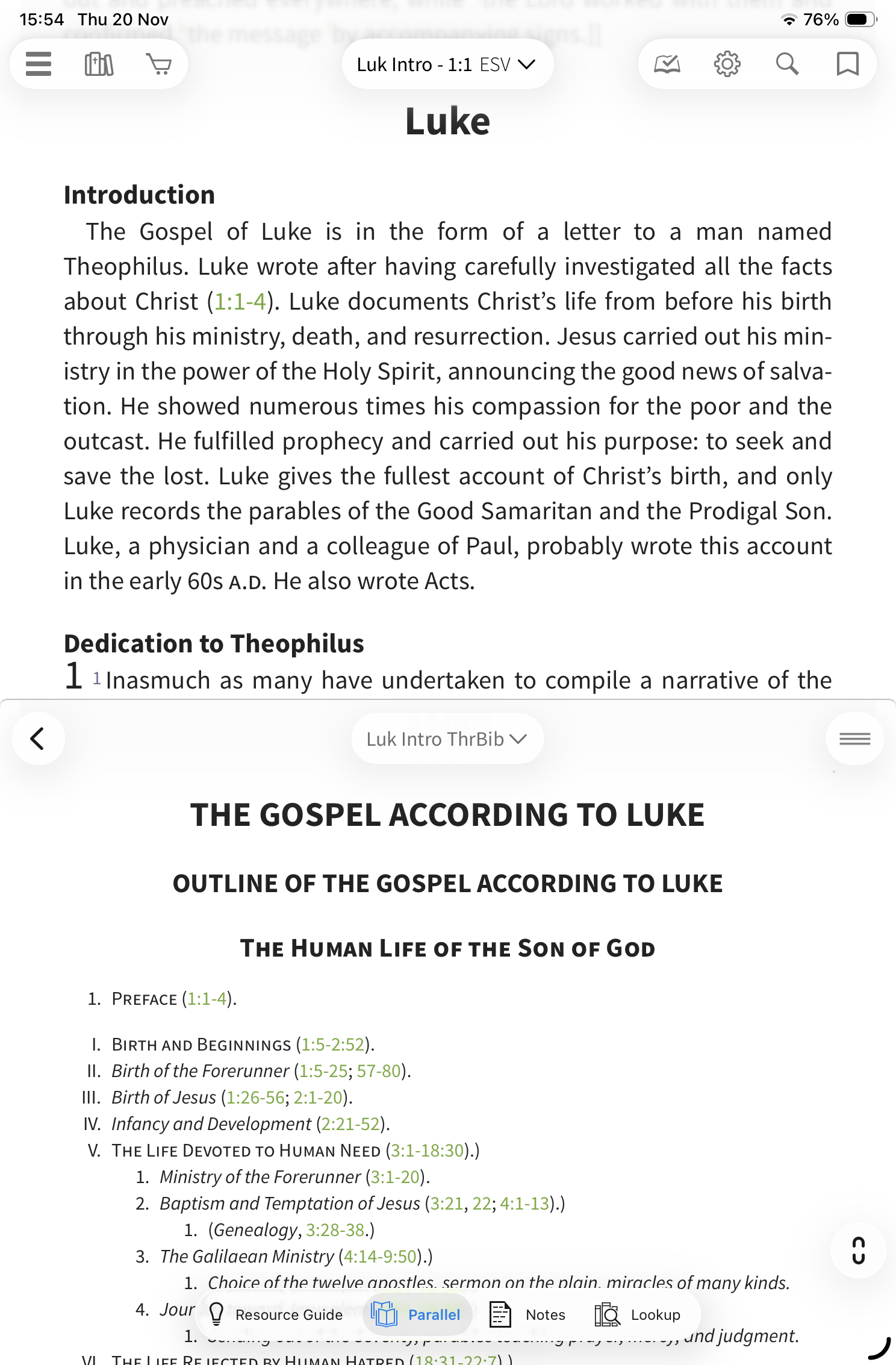 Linked - This icon indicates that the windows are currently linked. If you scroll in the main window, the Resource Guide/Parallel window will follow along. However, if you scroll in the Resource Guide/Parallel window the link will be broken. If you tap this icon, you will lock the window link.