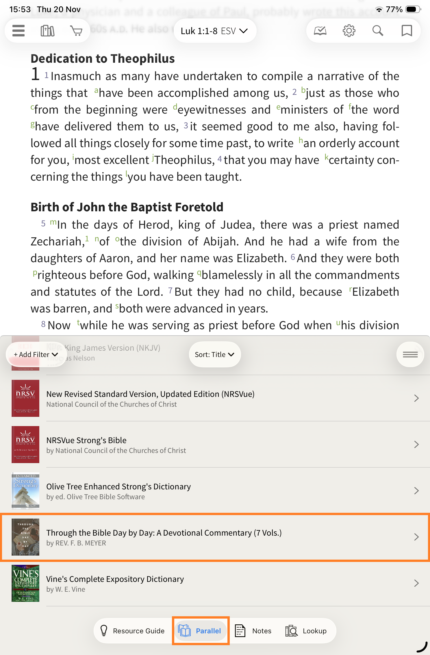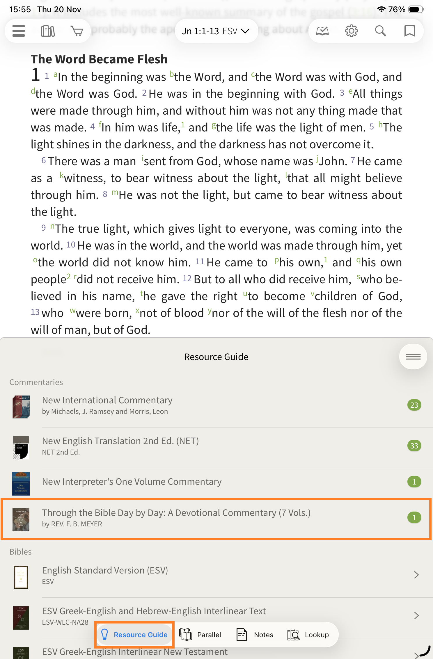 Tap Parallel and locate the commentary in the list of your resources. Tap on Through the Bible Day by Day to open it and use it alongside the Bible text.
