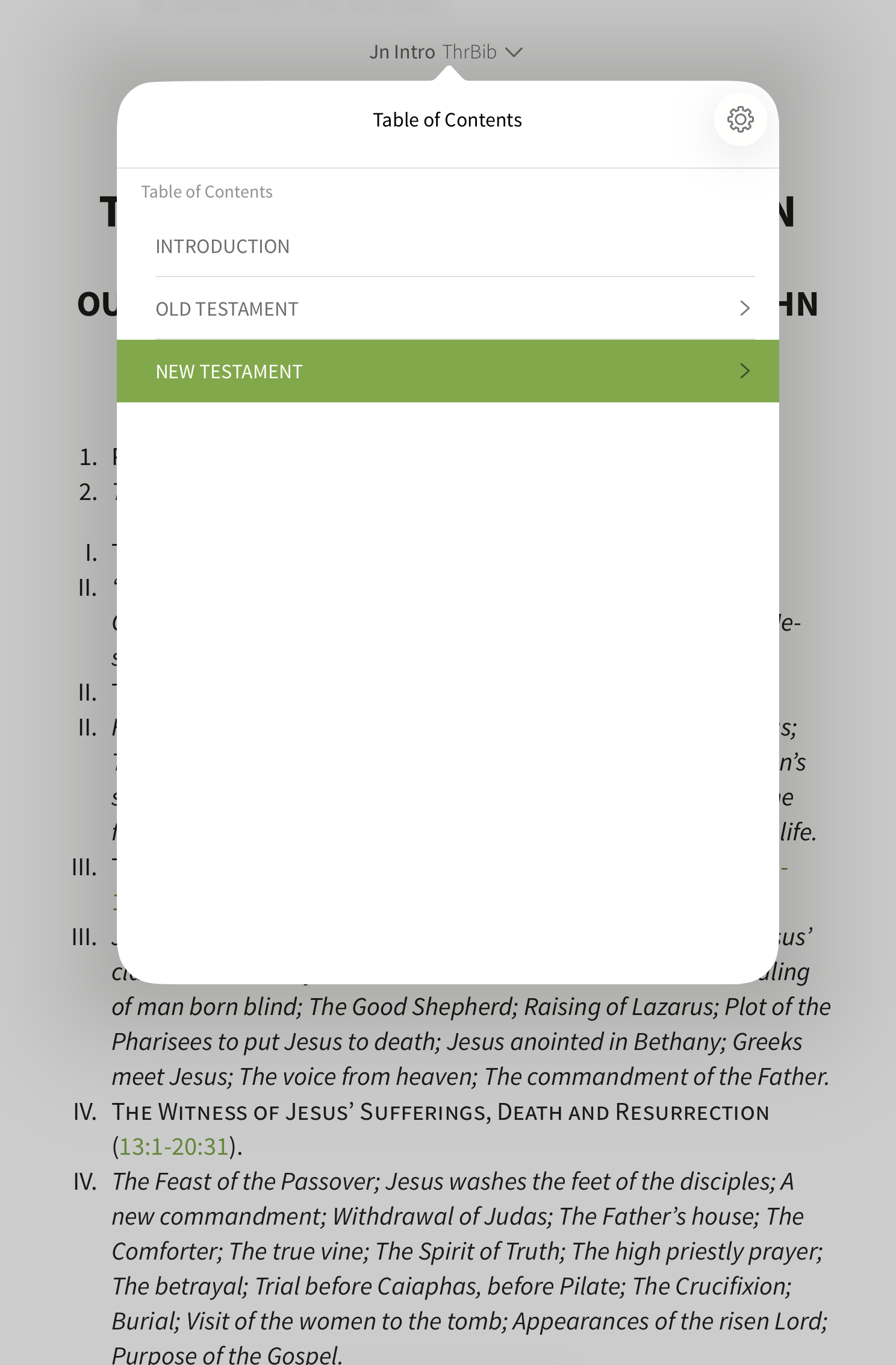 Tap on Through the Bible Day by Day in your Library to open it in the main window. This option will allow you to navigate into the commentary's Table of Contents. To access the Table of Contents, simply tap on the header.