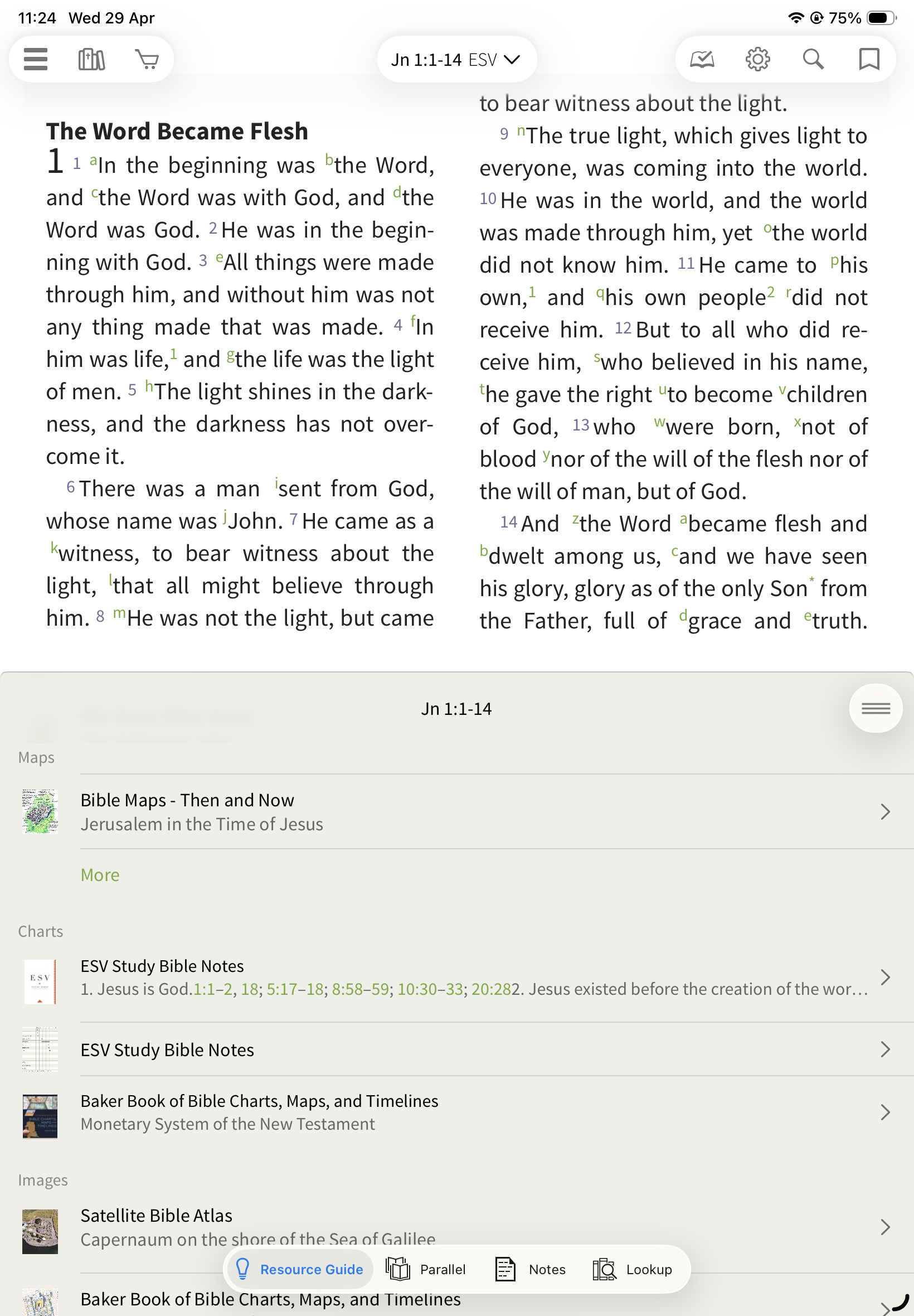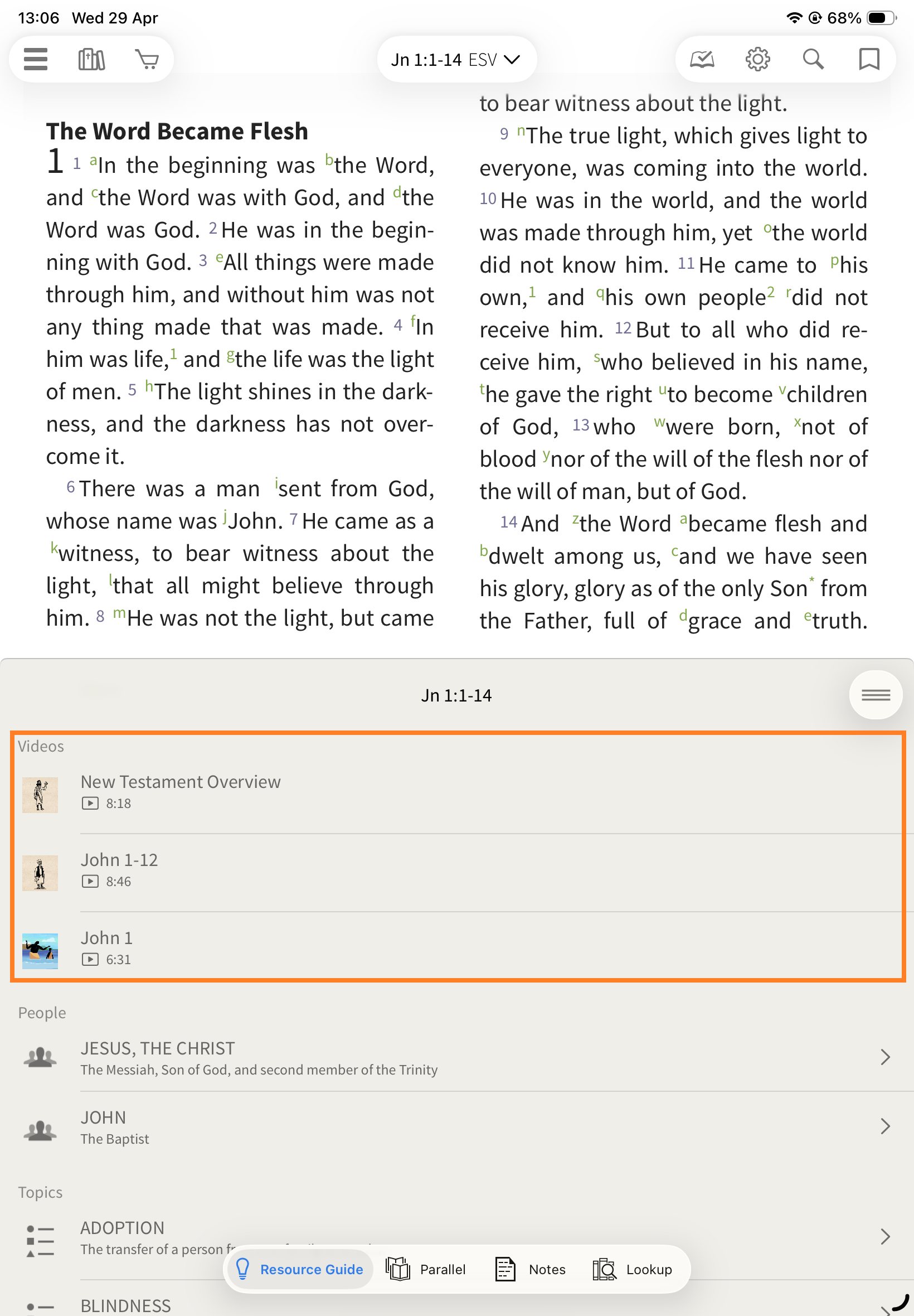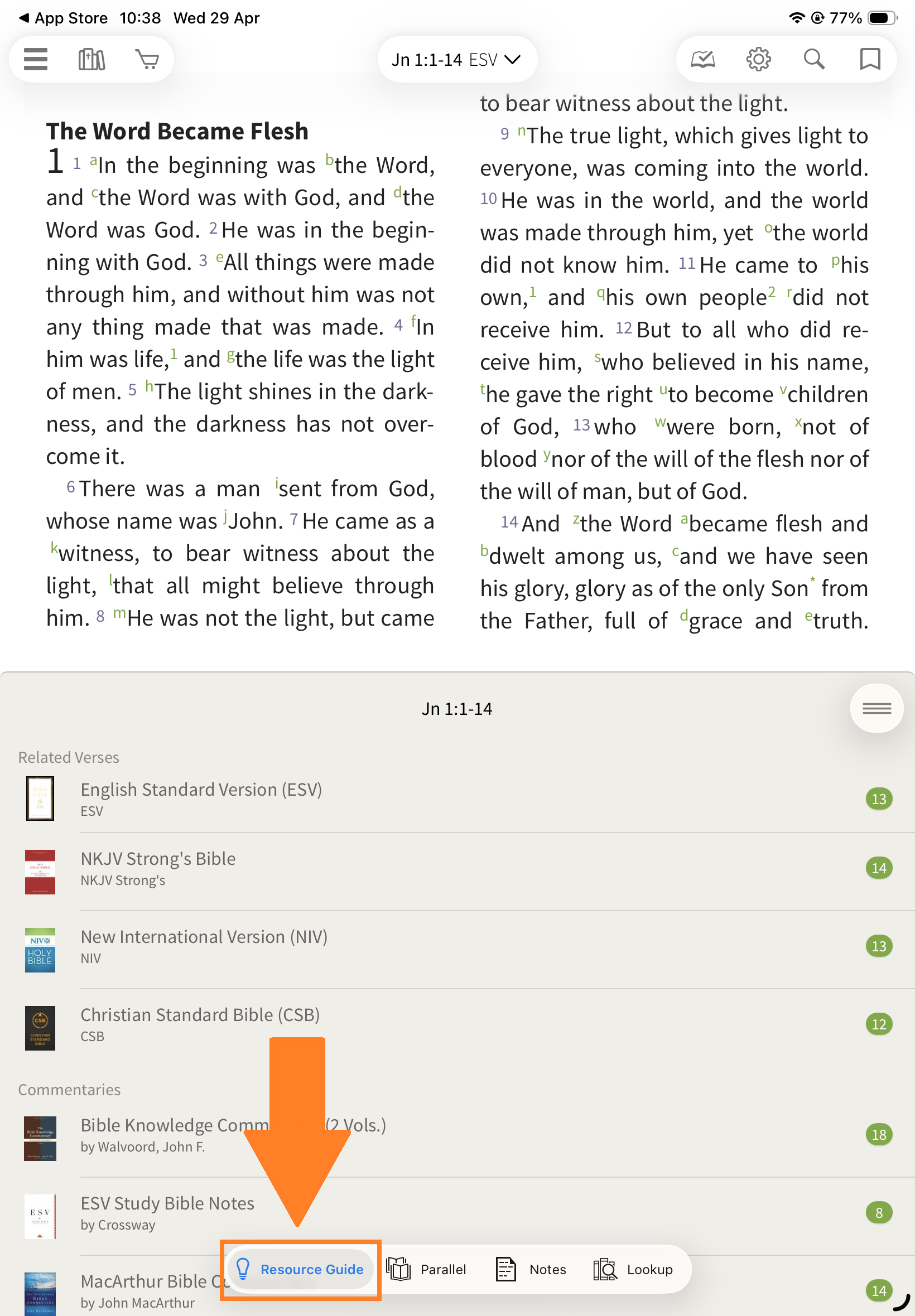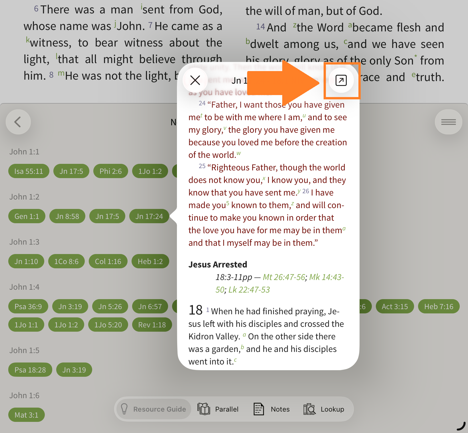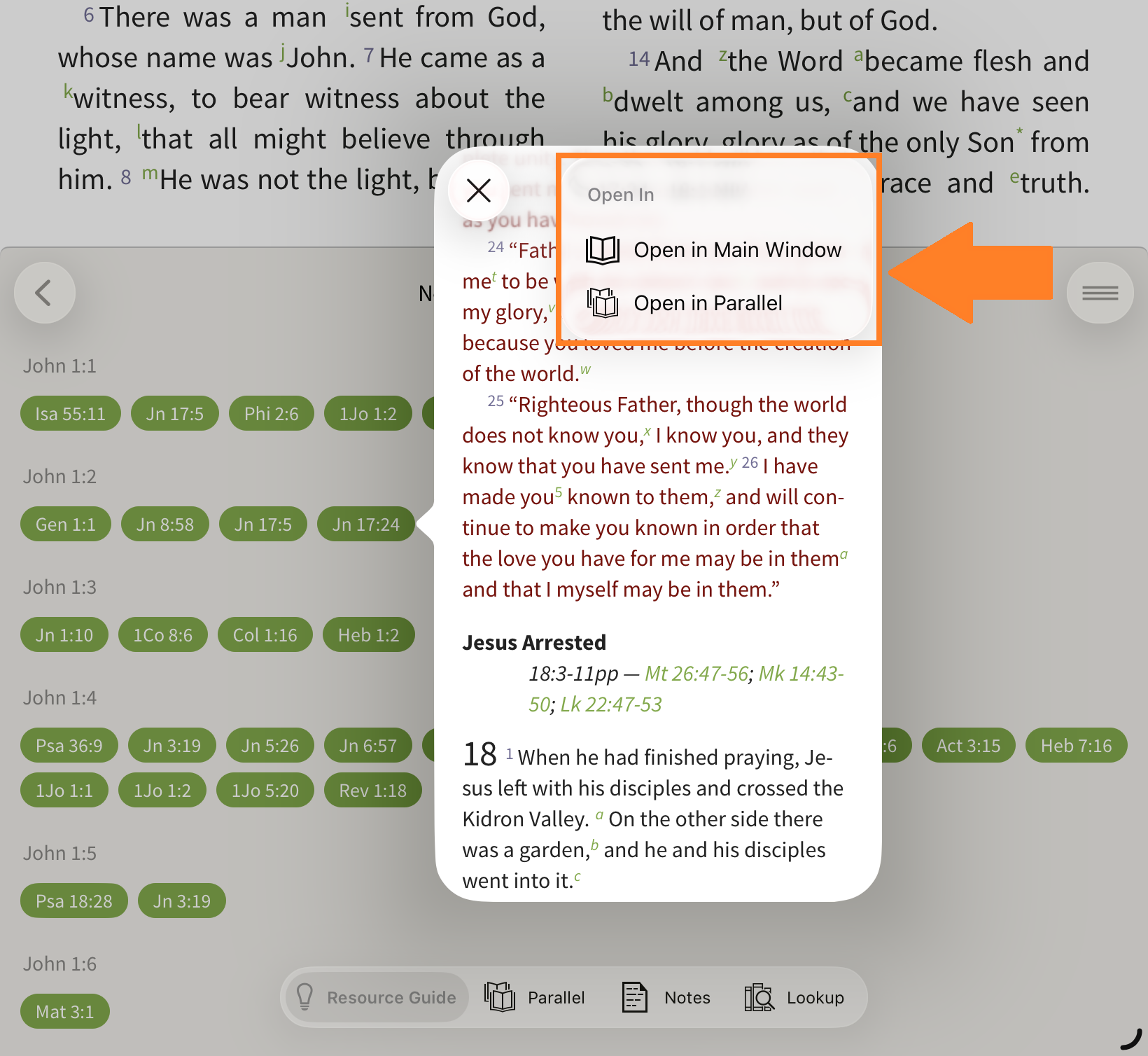 In the Olive Tree Bible App, the Resource Guide helps you quickly access all relevant study material for the passage you’re reading—without needing to manually search through your library.