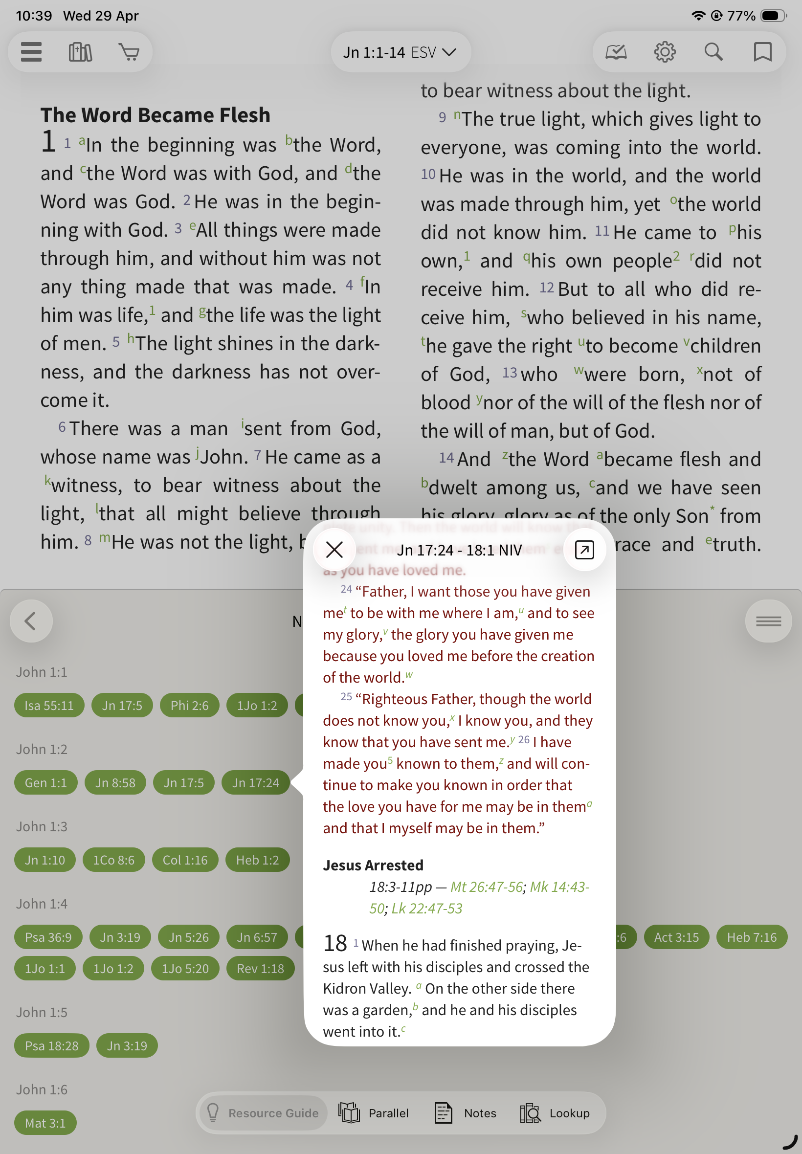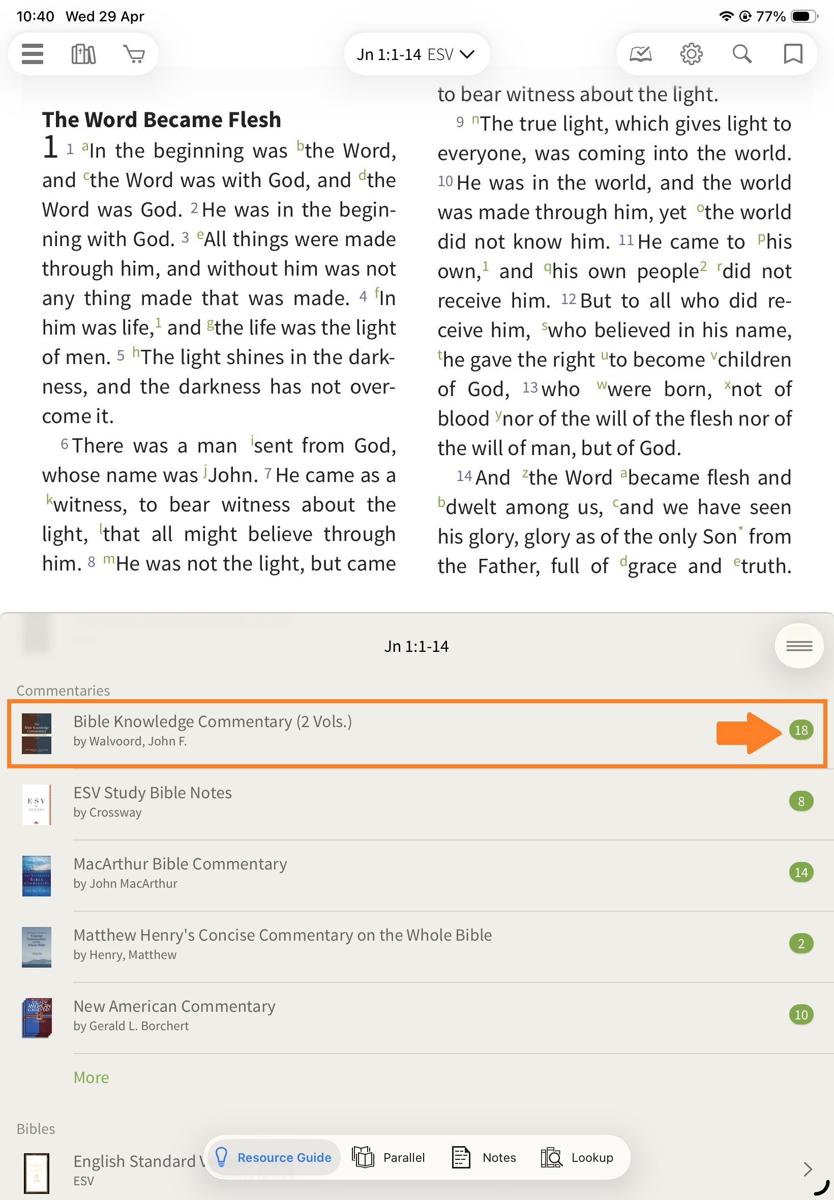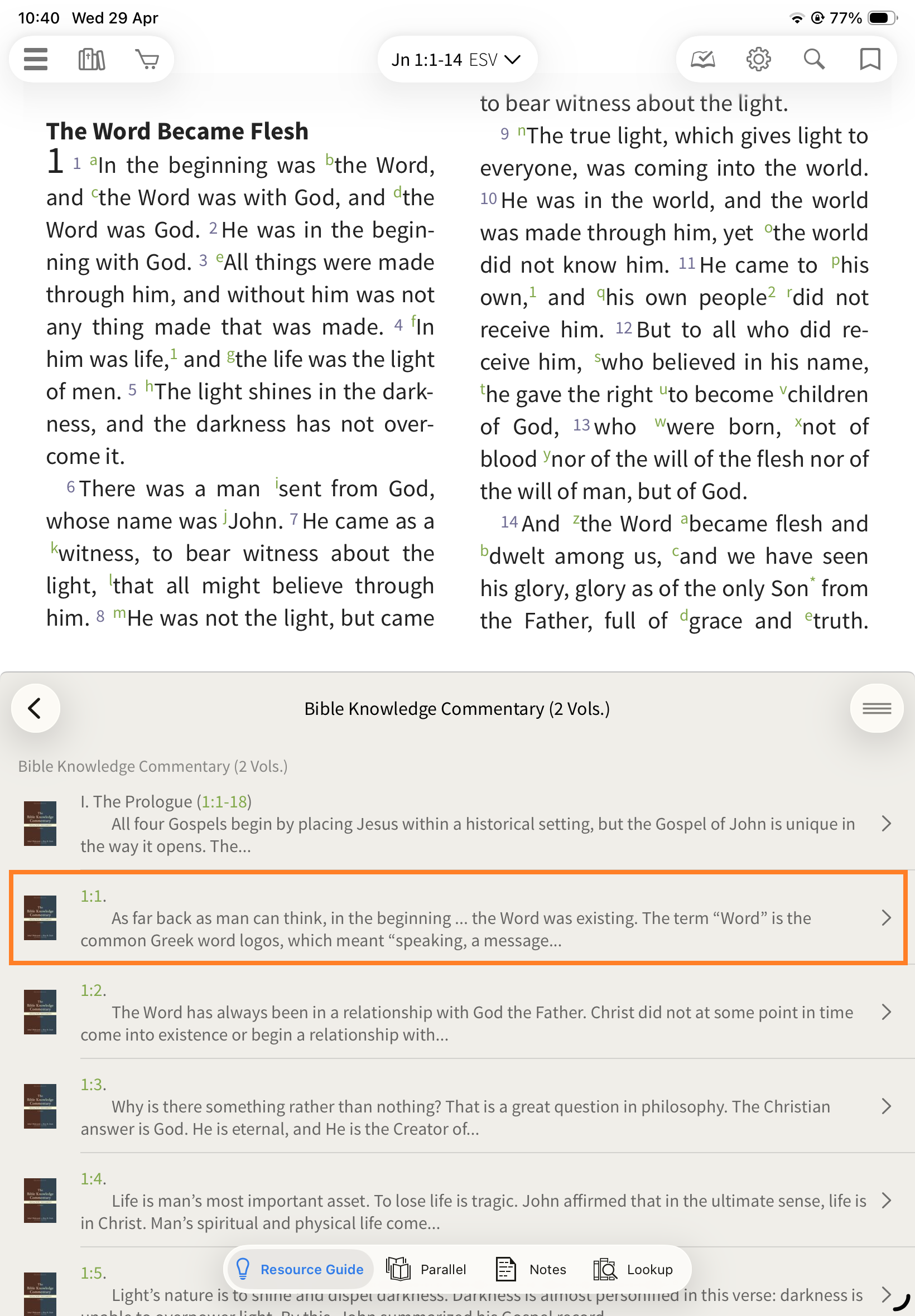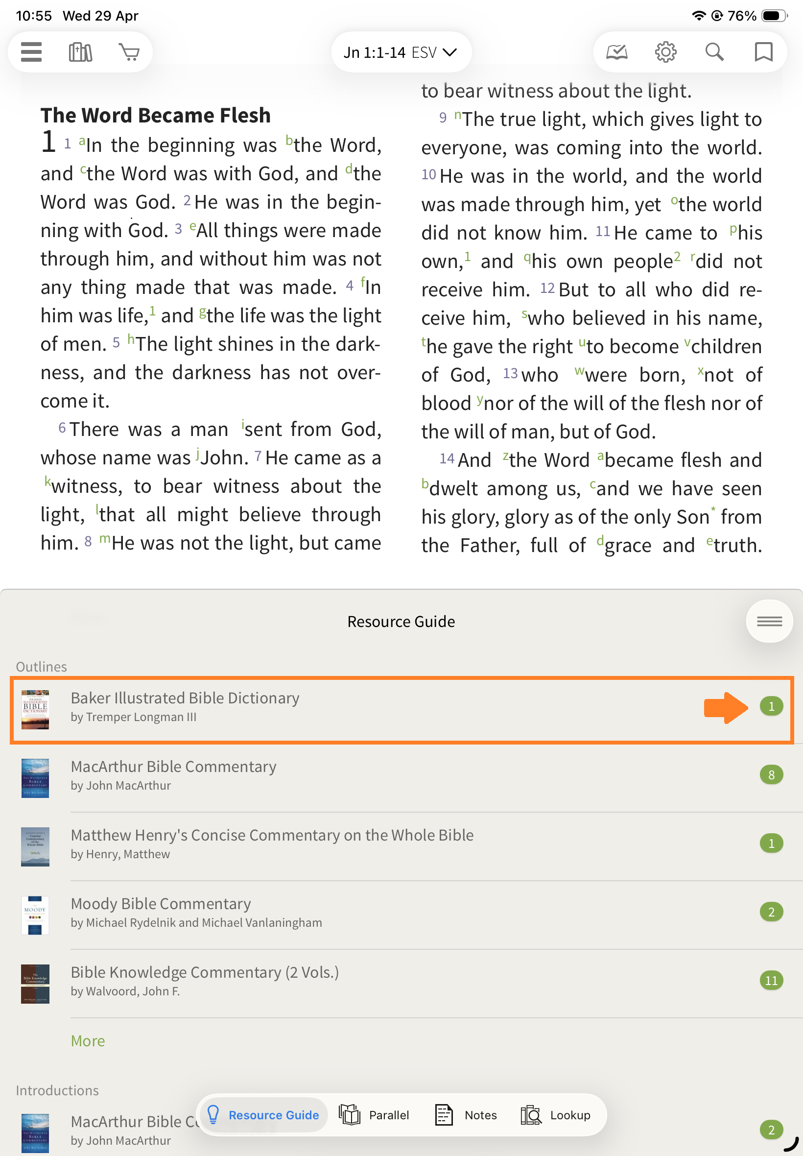 In the Olive Tree Bible App, the Resource Guide helps you quickly access all relevant study material for the passage you’re reading—without needing to manually search through your library.