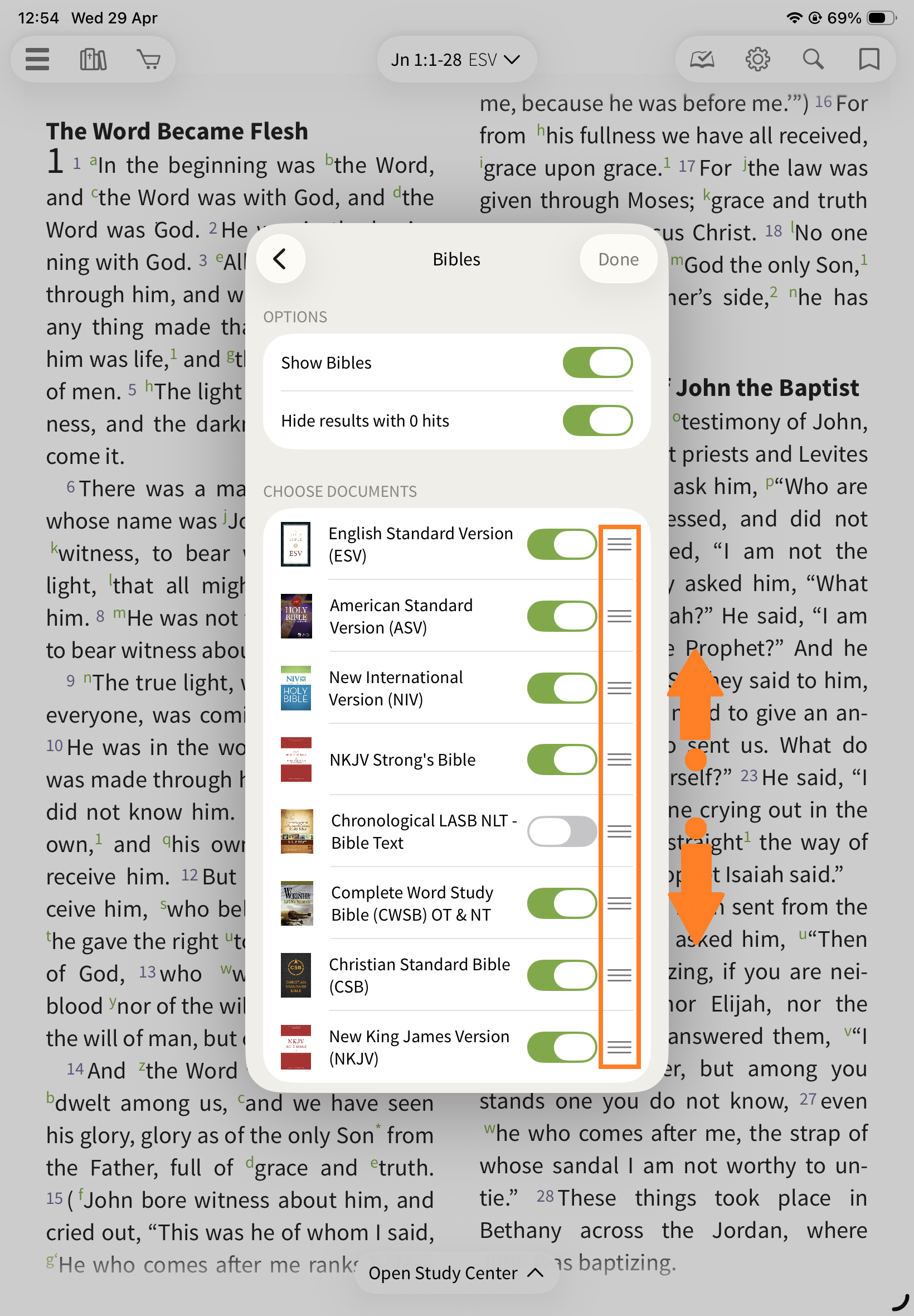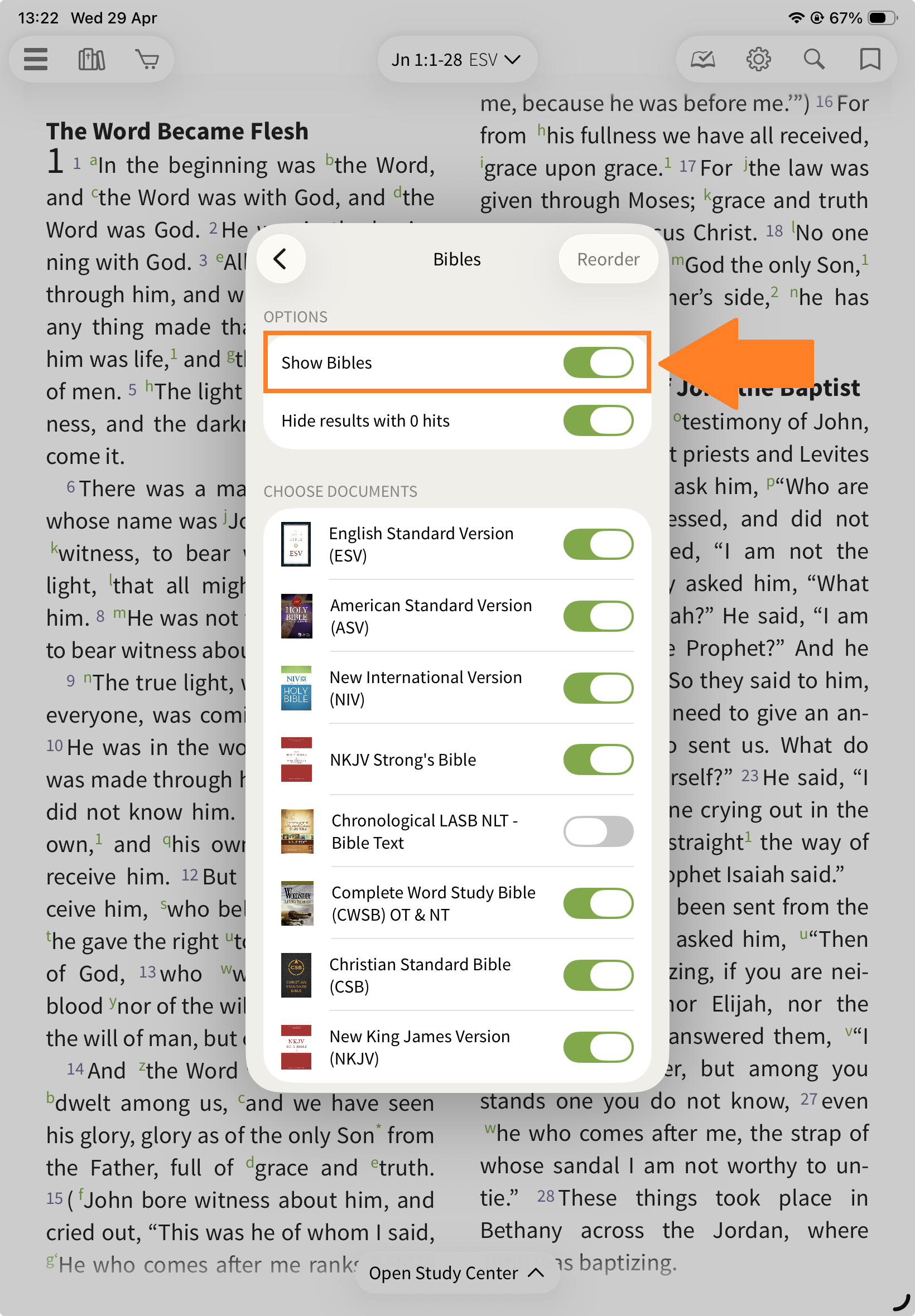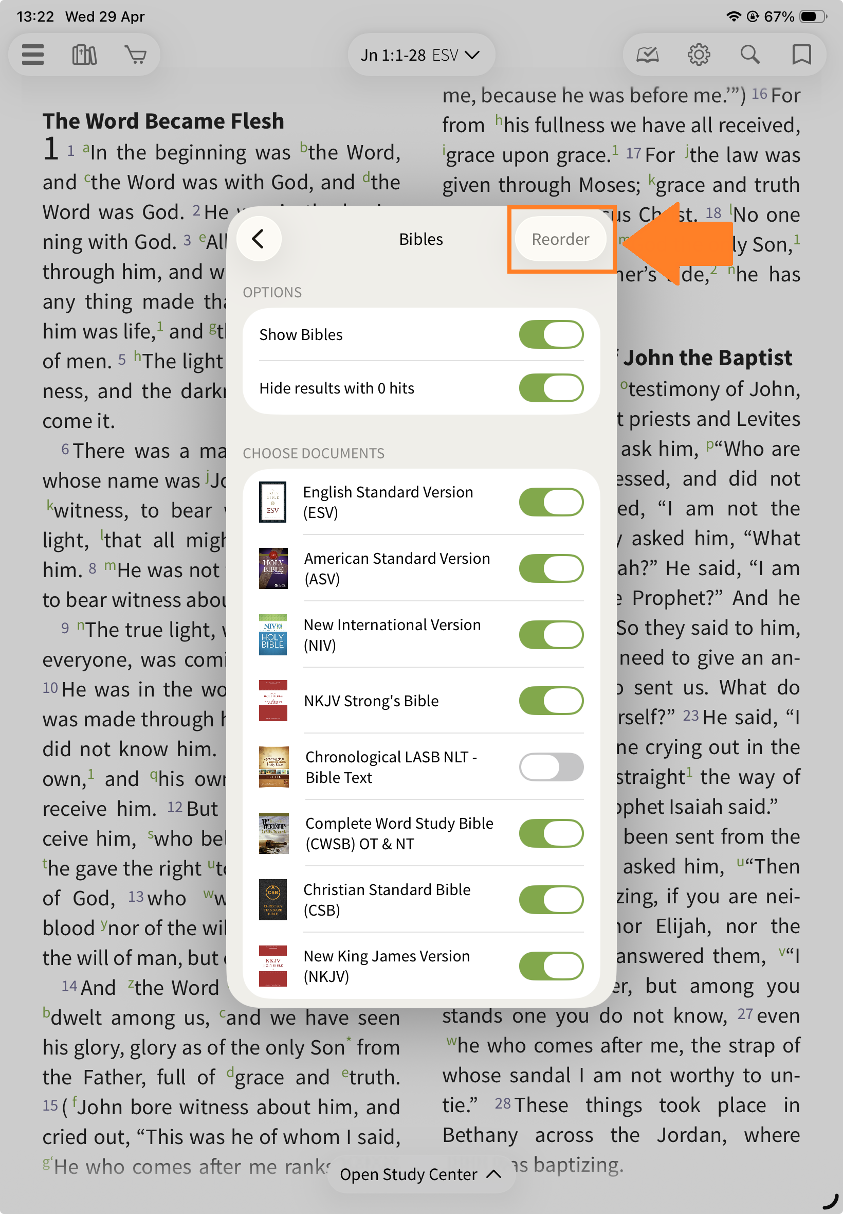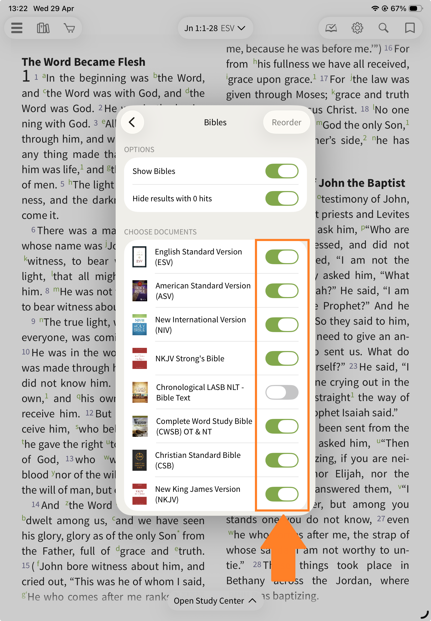 This section allows you to view another Bible translation alongside your main text.