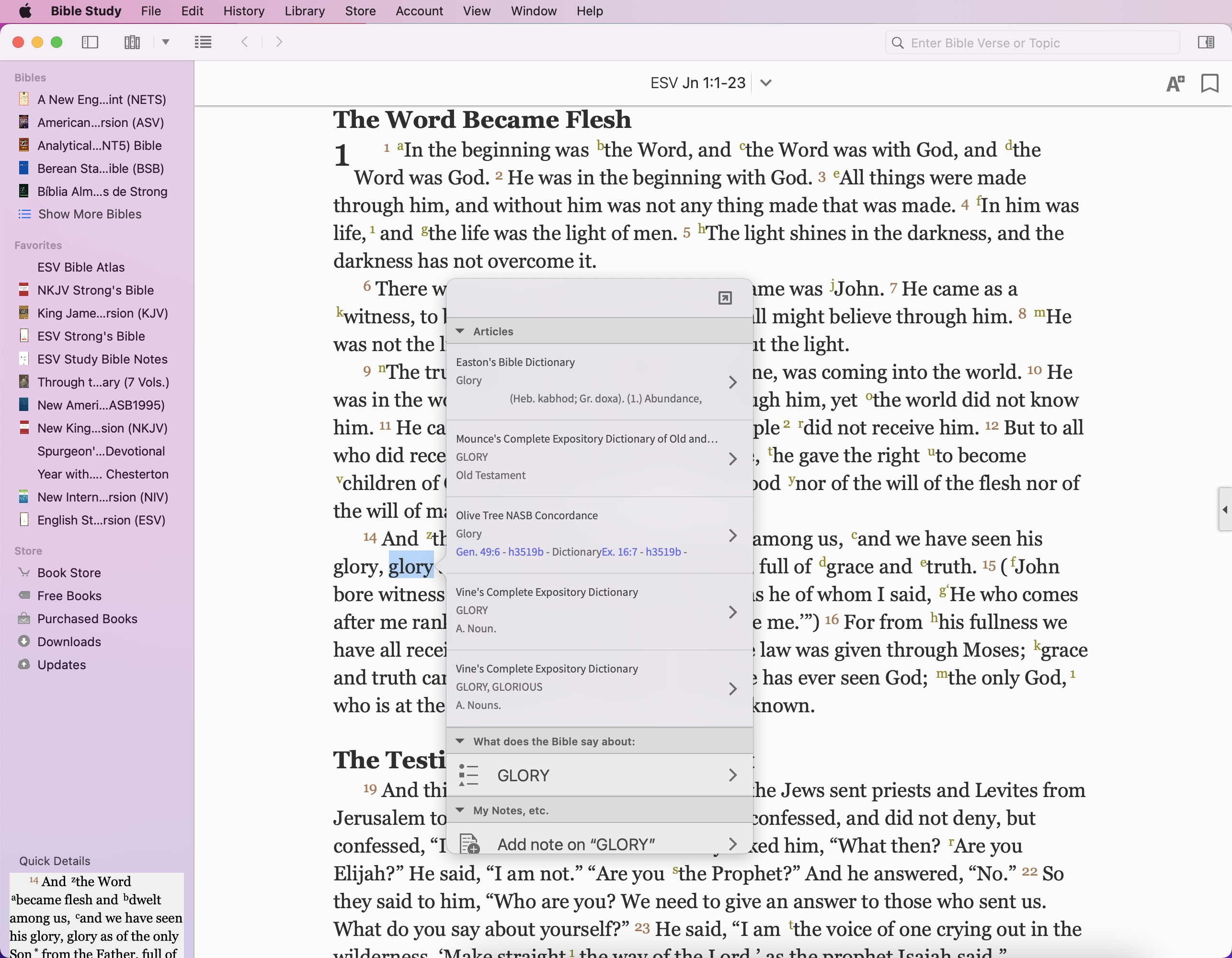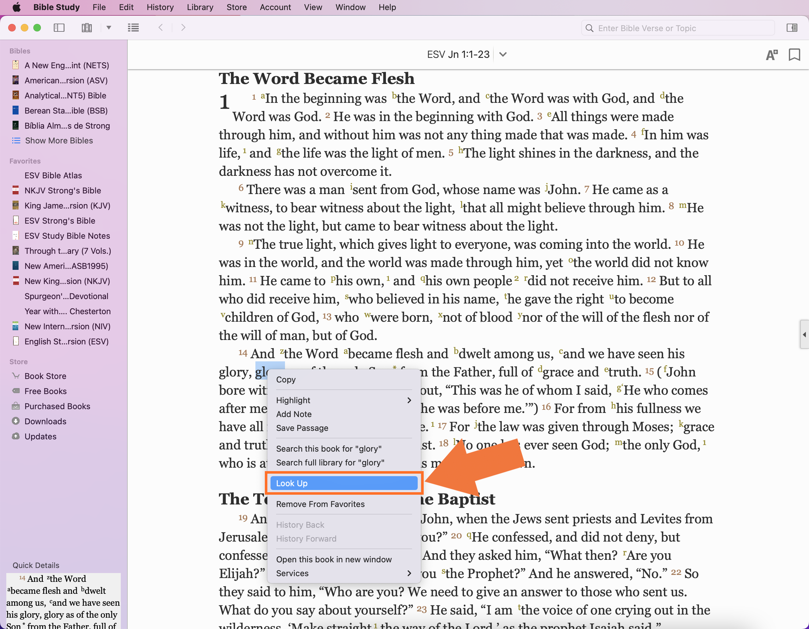 When reading Scripture, you can highlight and secondary click a word in the Bible text and a menu will appear with various options. Select the 'Lookup X' option to get articles from your downloaded dictionaries on that specific word.
