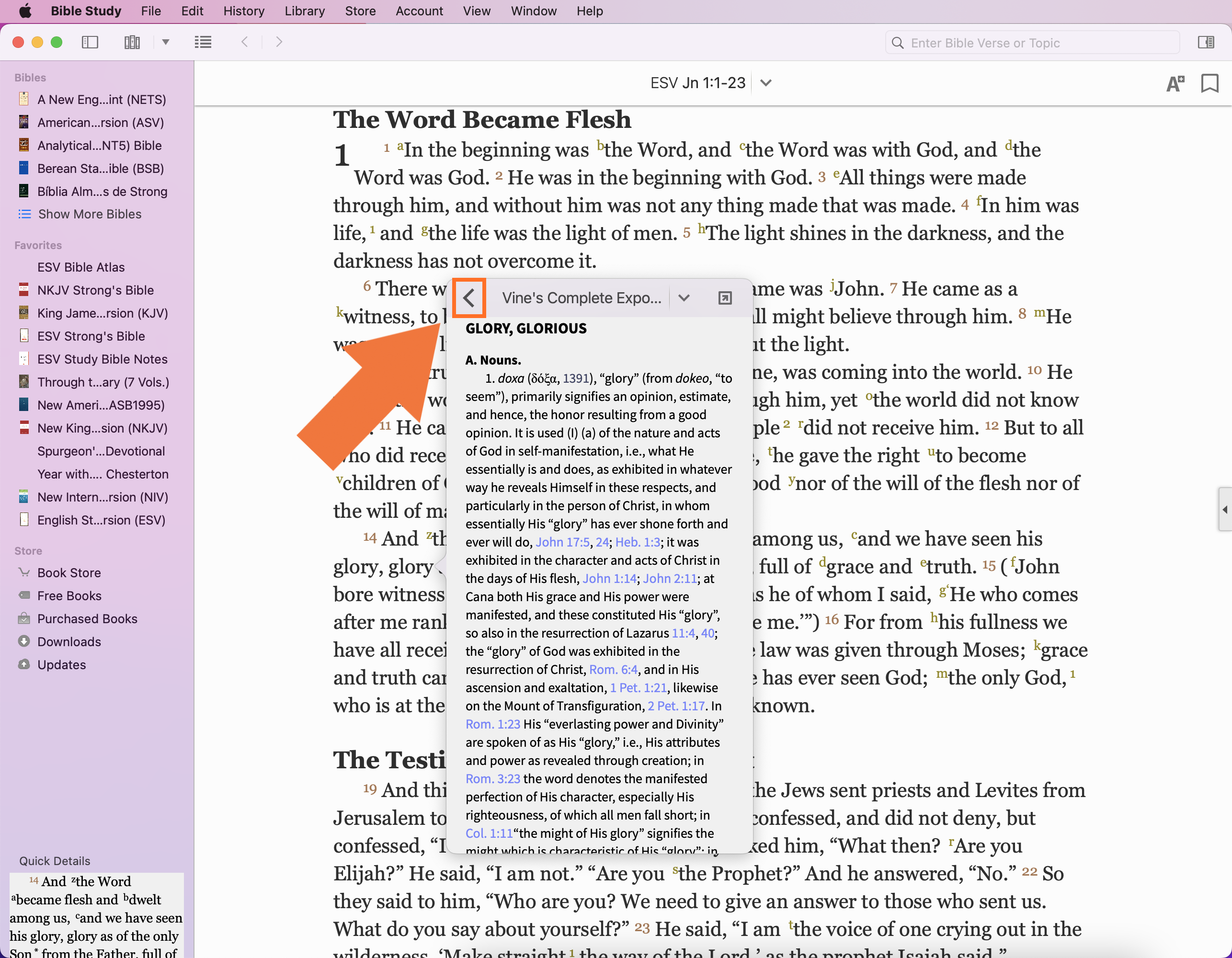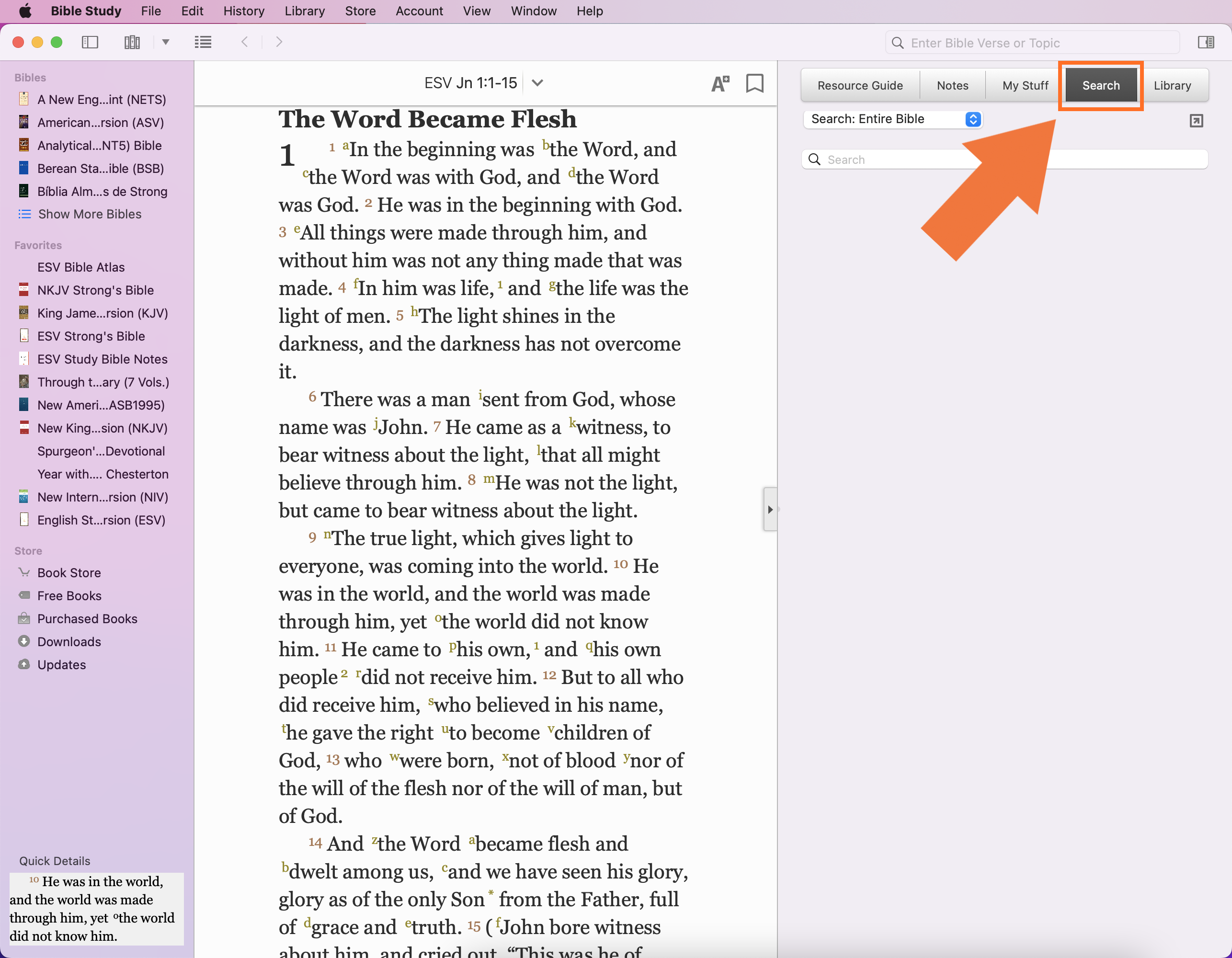 Within the Study Center, the Search tab allows you to see all of the information in your Library that relates to a particular subject. You will need to open the Study Center by clicking the icon in the upper right corner.