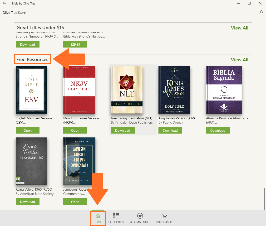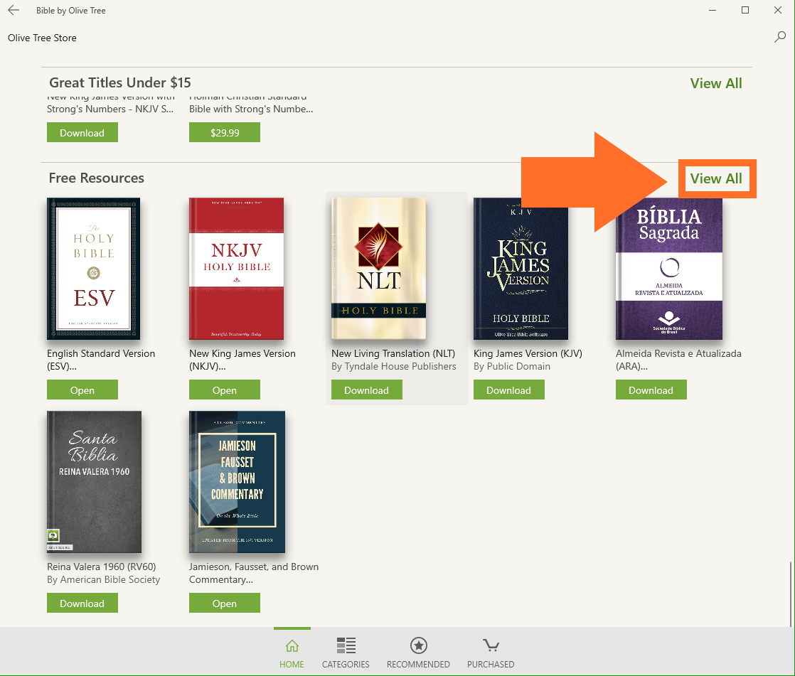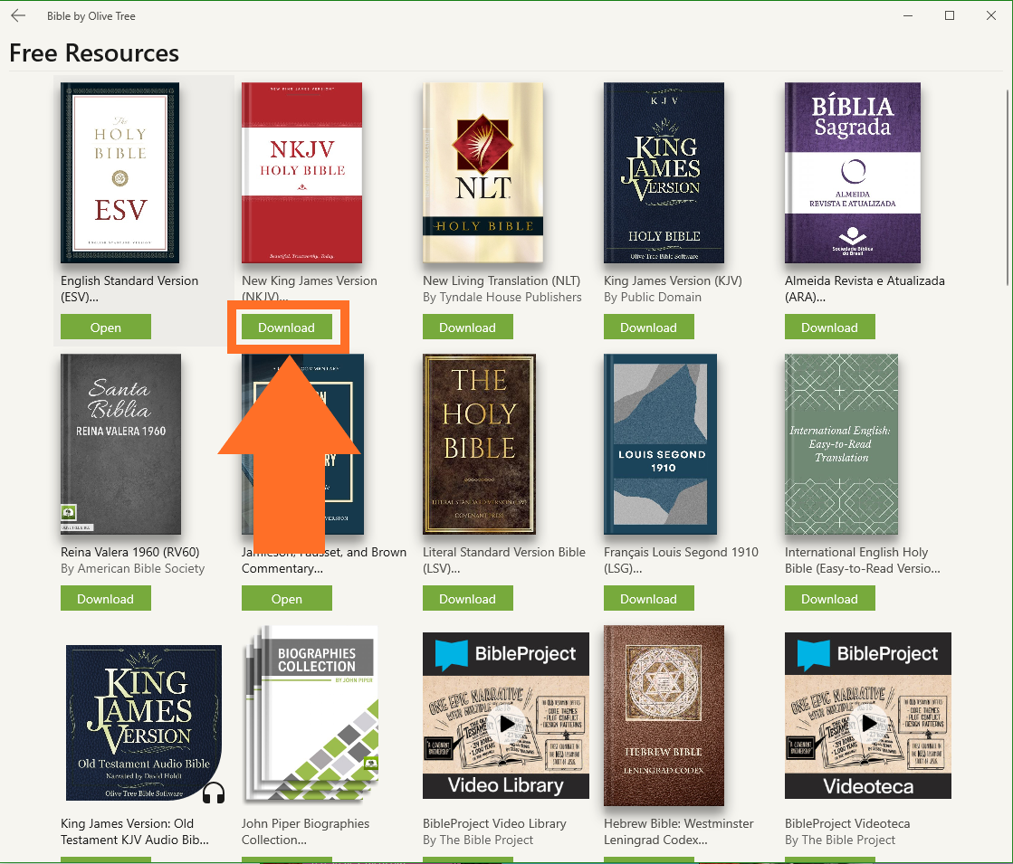 The Olive Tree Bible App is free to download in the Microsoft Store. Once you install the app on your device(s), you will have access to free features, like reading plans, personal notes and highlights, parallel reading, and free resources. We offer over 100 free resources, including a number of Bible translations, so you can start your Bible study in the Olive Tree Bible App right away. This article will show you how to install and open free resources in your Olive Tree Bible App.